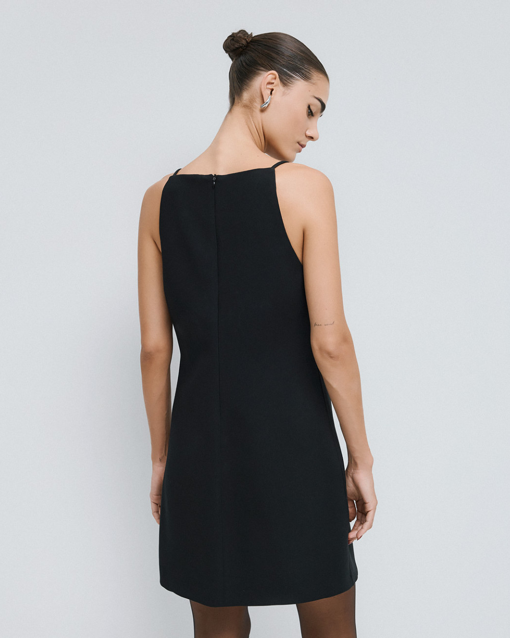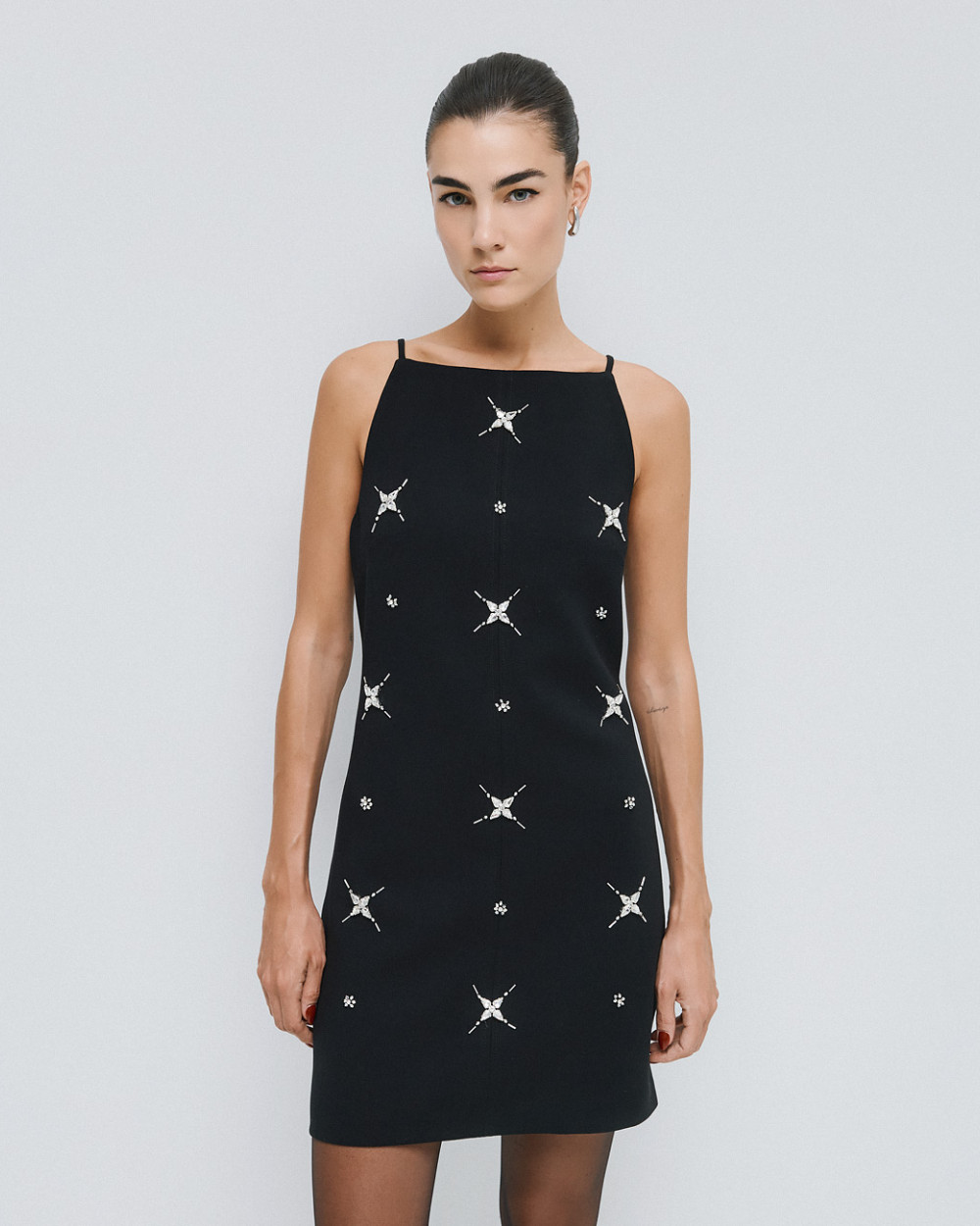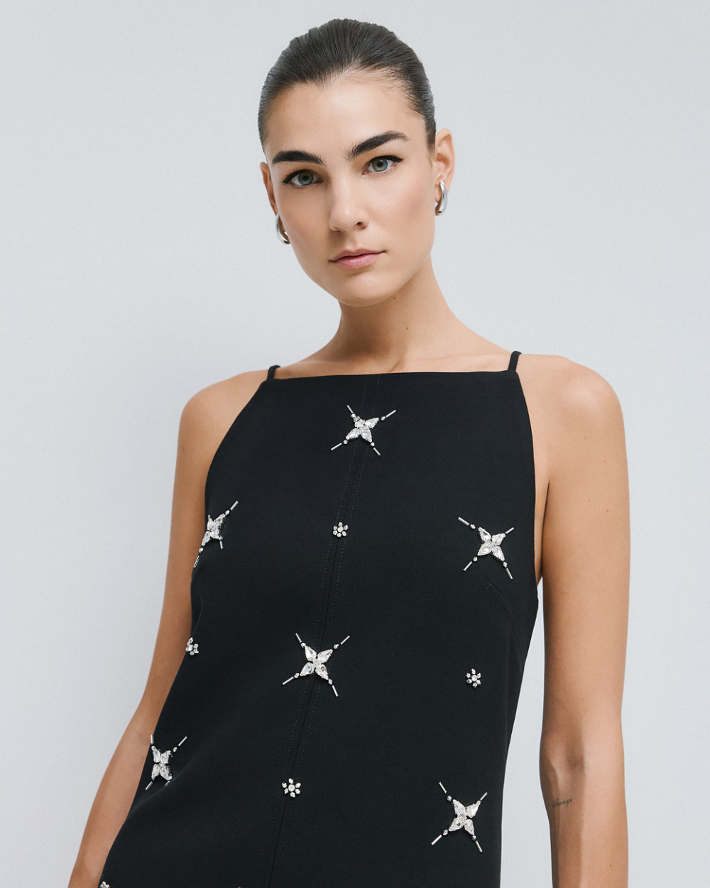 Μίνι φόρεμα με halter λαιμόκοψη και εντυπωσιακά κεντήματα με στρας στο μπροστινό μέρος. Διαθέτει ενσωματωμένη φόδρα και κλείσιμο με κρυφό φερμουάρ πίσω.