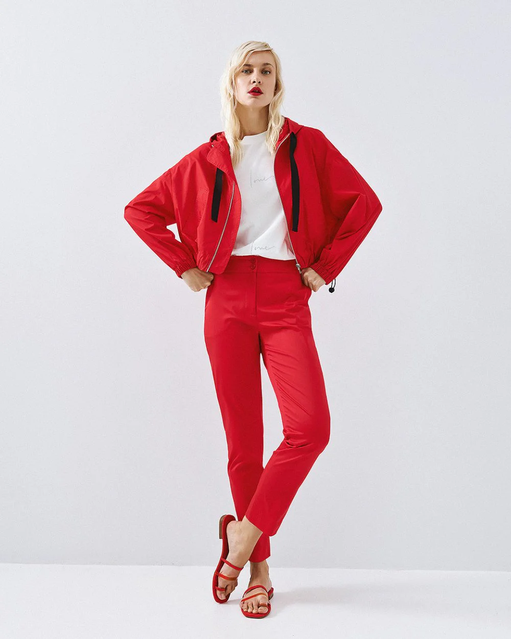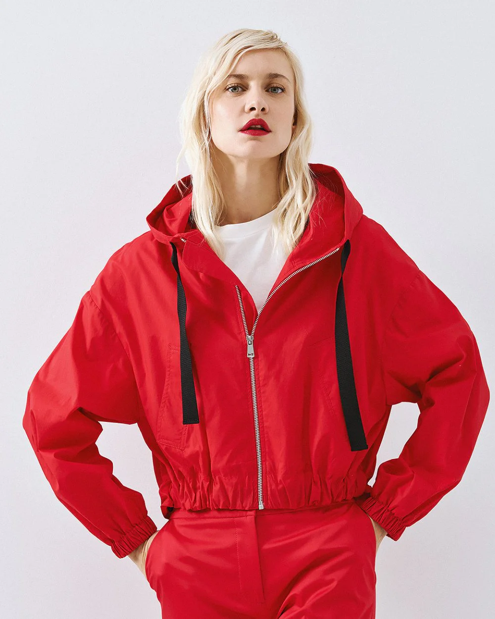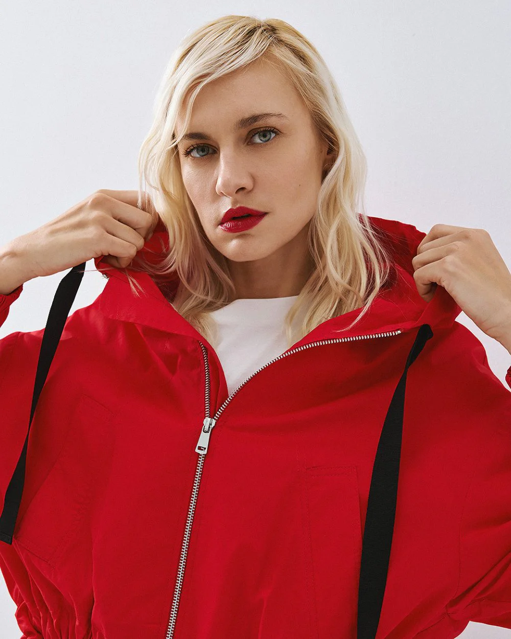 Bomber τζάκετ με ενσωματωμένη κουκούλα με κορδόνι και μακριά μανίκια με ελαστικές μανσέτες. Διαθέτει πλαϊνές τσέπες, κλείσιμο με φερμουάρ μπροστά και ελαστικό τελείωμα με κορδόνια προσαρμογής.
