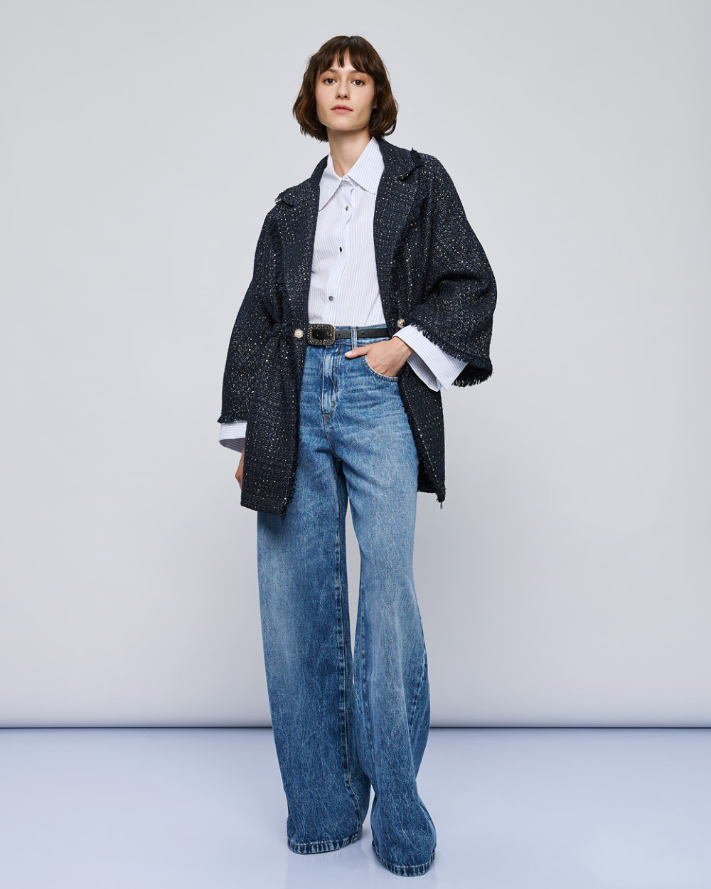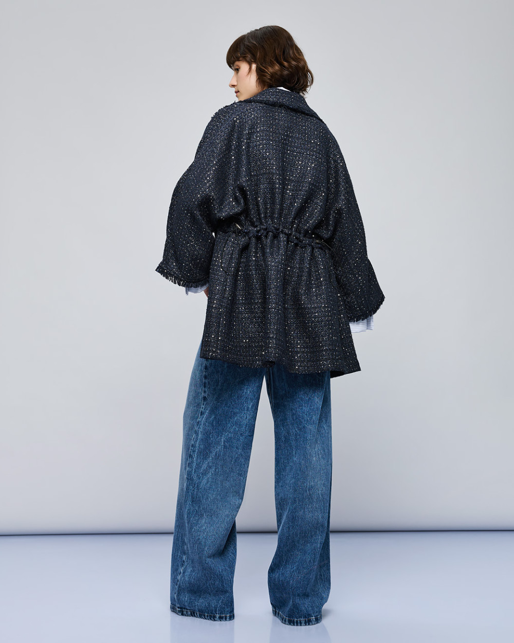 Tweed lurex τζάκετ με πούλιες και μακριά φαρδιά μανίκια. Διαθέτει πέτο γιακά, κορδόνια προσαρμογής στη μέση και λεπτομέρειες από ξέφτια.