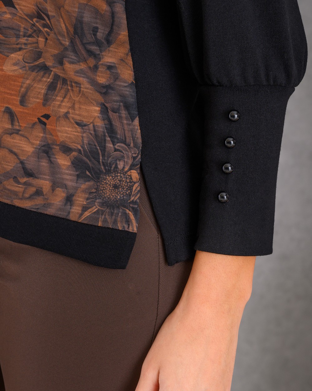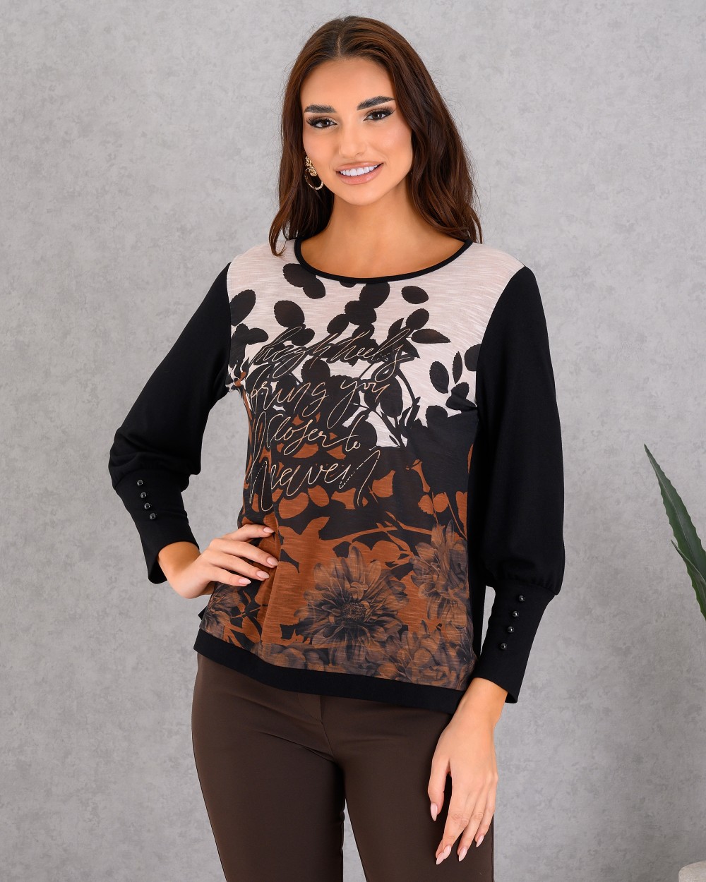 Μπλούζα τύπωμα φύλλα και γράμματα και μανσέτα με κουμπάκια.