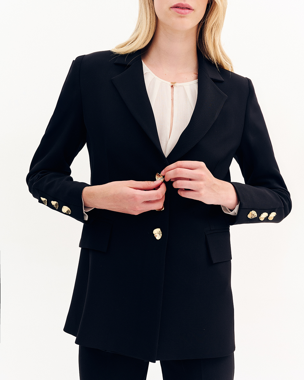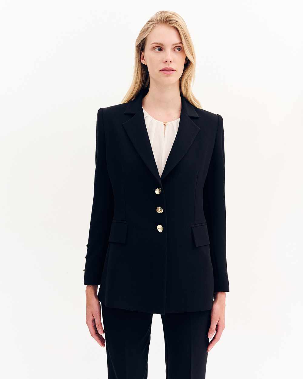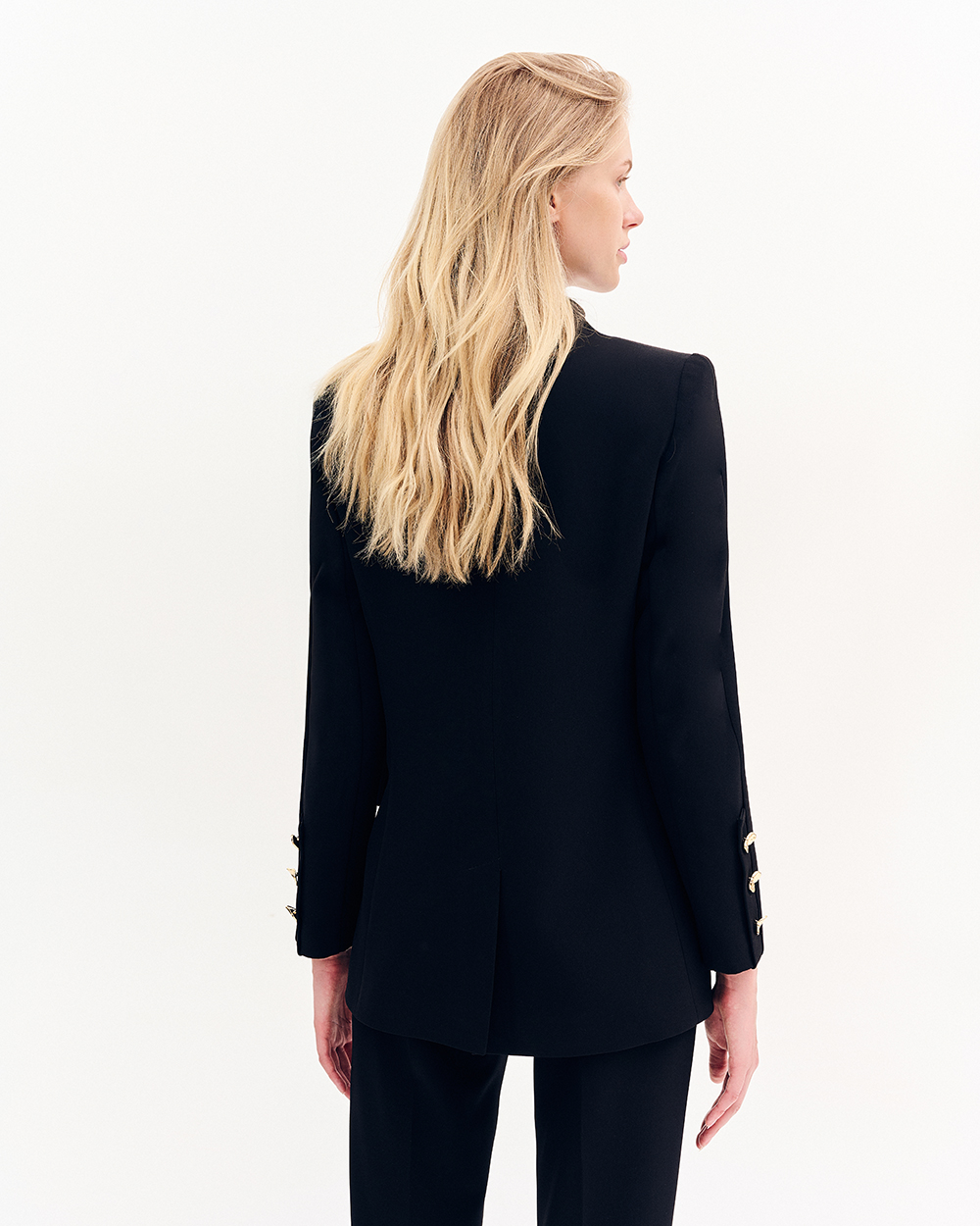 Σακάκι κρεπ μεσάτο. Γιακάς με πέτο. Βάτες και μακρύ μανίκι. Τσέπες πατ με καπάκι. Κλείσιμο μπροστά με κουμπί. Παντελόνι σε cigarette γραμμή, κλειστές τσέπες στο μπροστινό μέρος με χρυσά διακοσμητικά κουμπία. Τσέπες φιλέτο στο πίσω μέρος. Κάτω μέρος με ανοίγματα στα πλάγια.