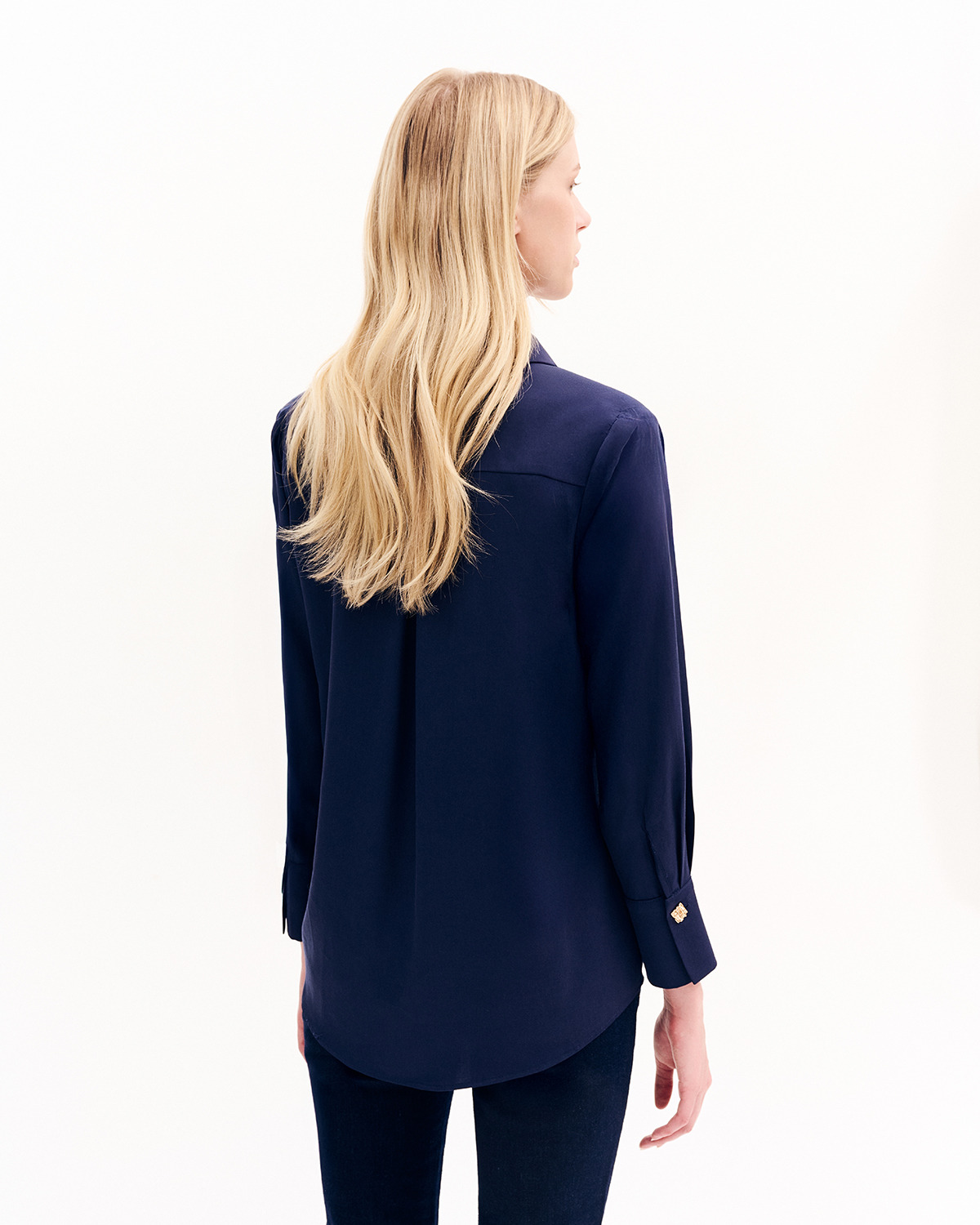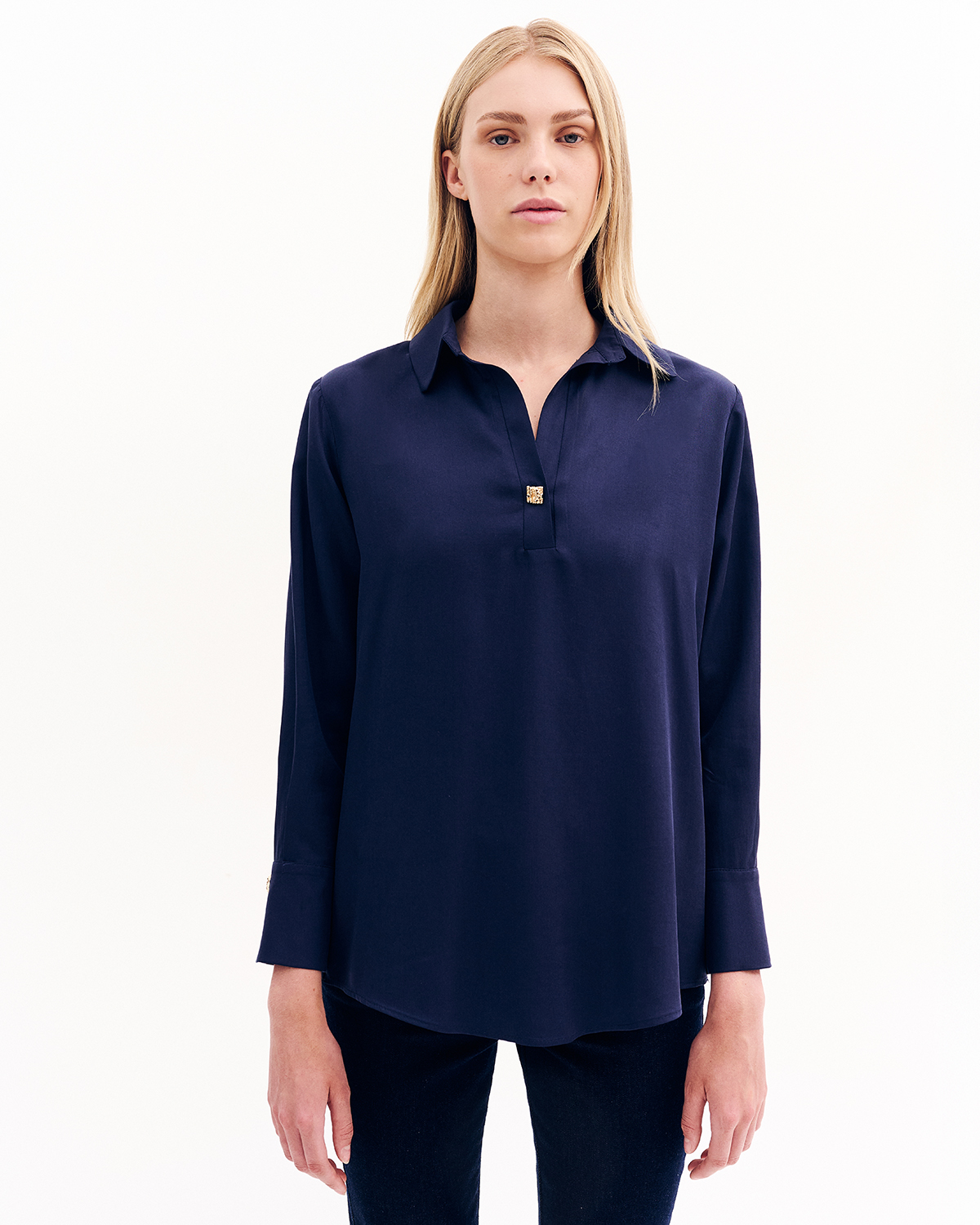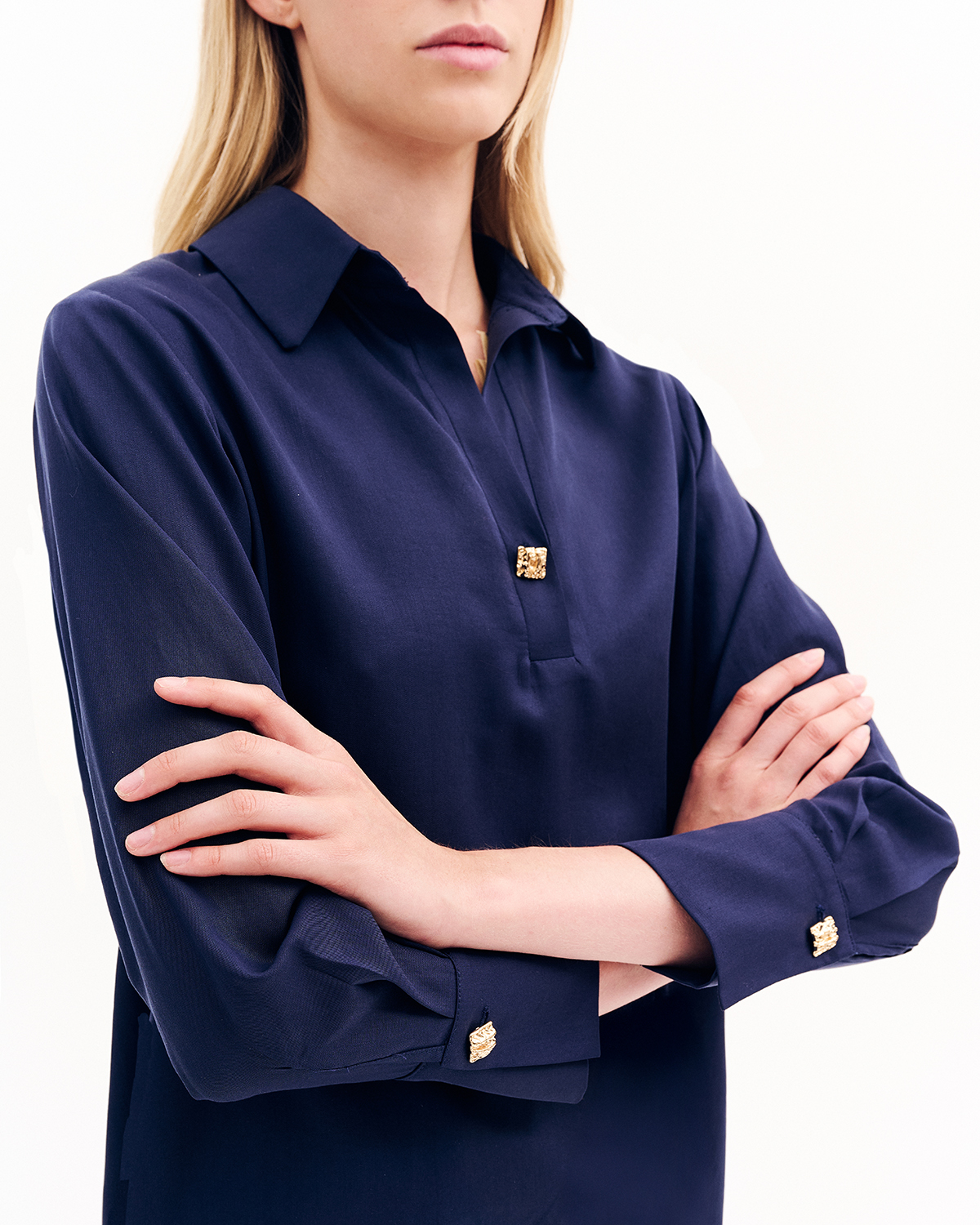 Μπλούζα με V λαιμόκοψη και γιακά. Χρυσά κουμπιά μπροστά και στις μανσέτες.