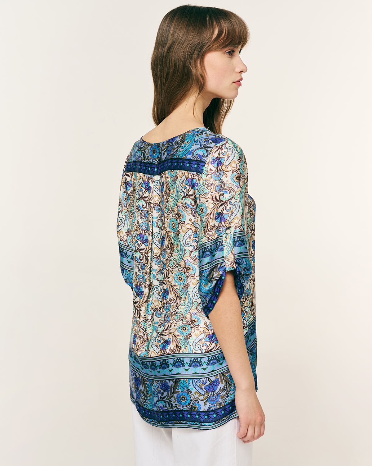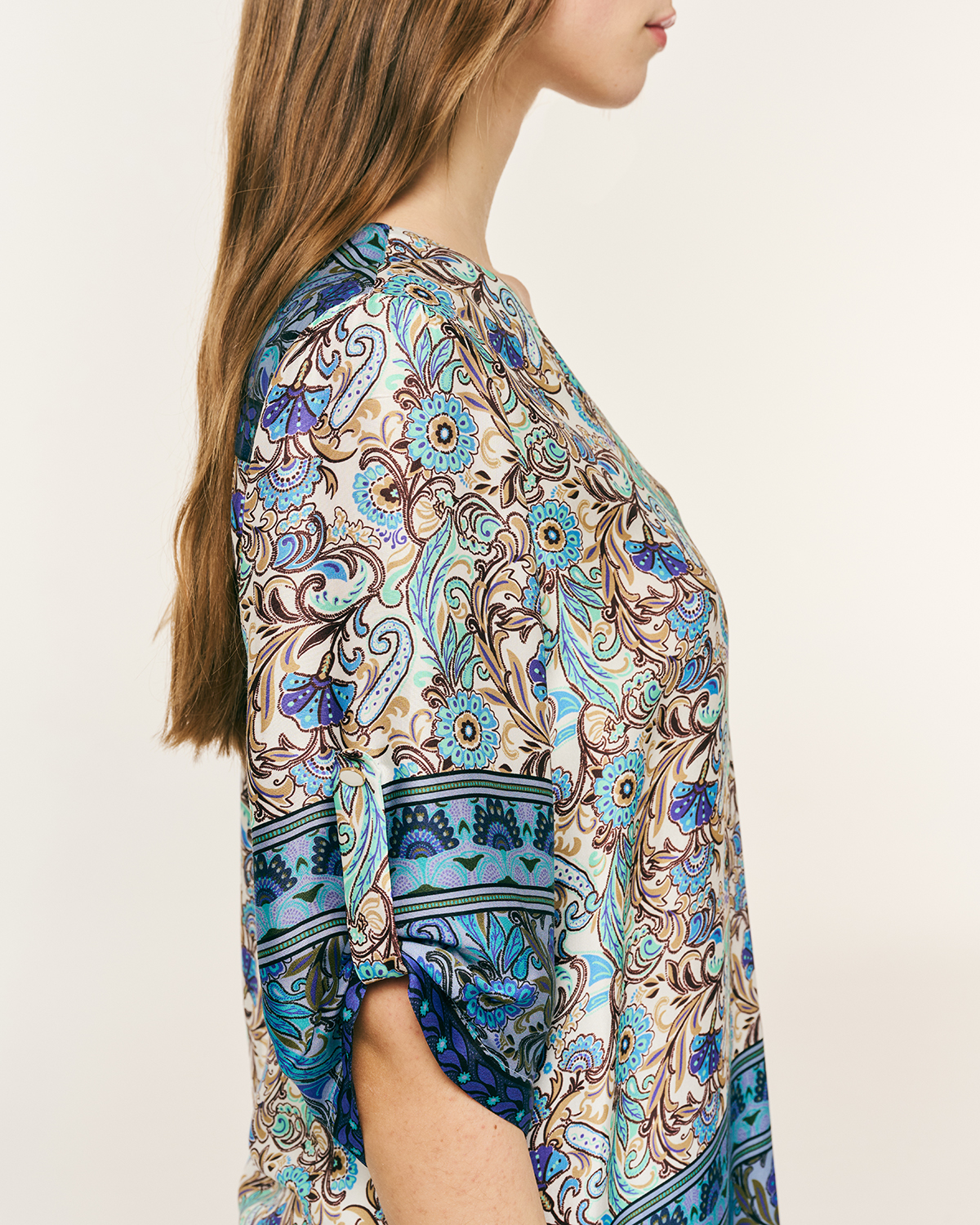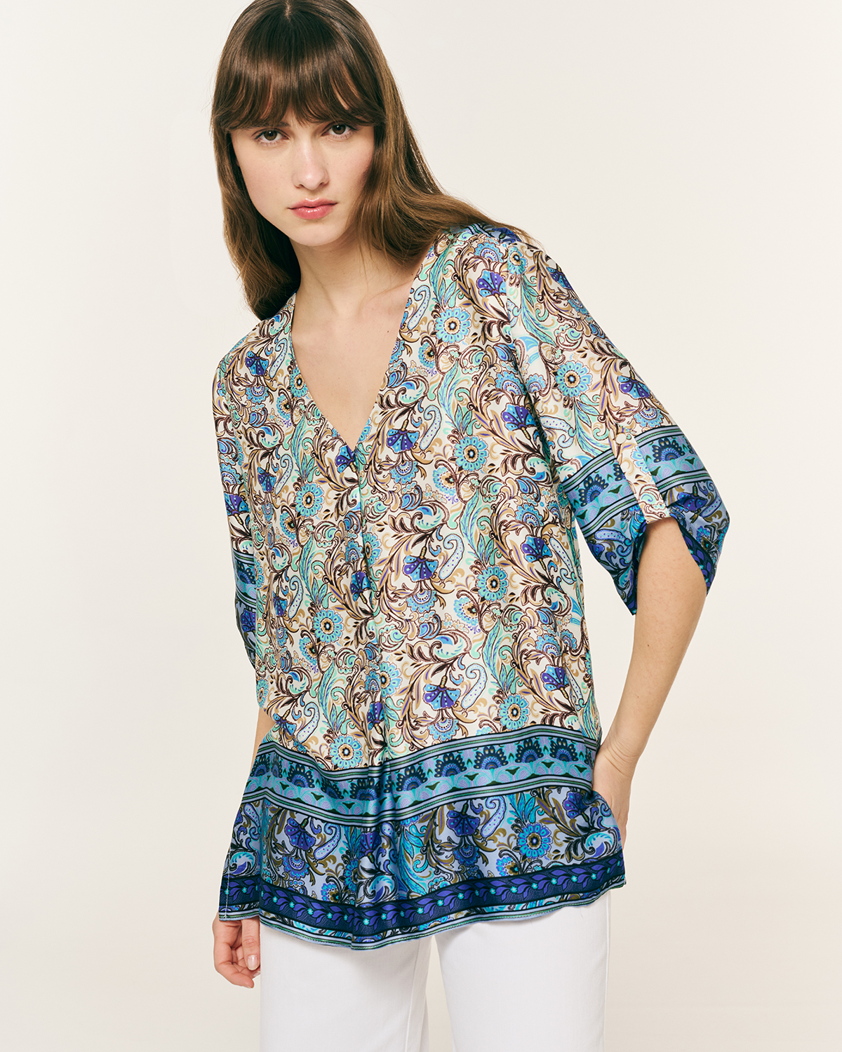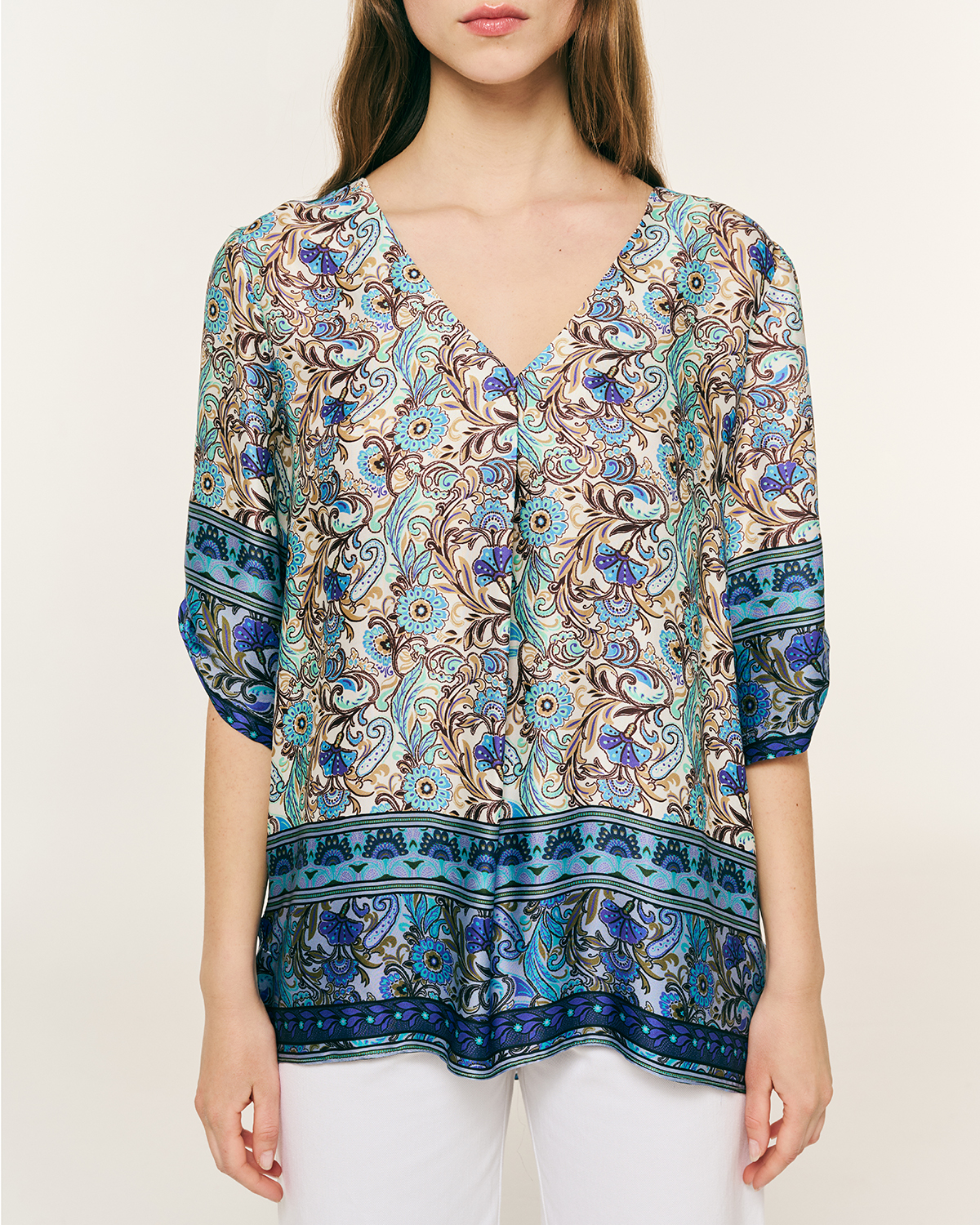 Μπλούζα βισκόζ εμπριμέ. ”V” λαιμόκοψη με μανίκια 3/4 και δέσιμο με κουμπί. Λεπτομέρεια, ανοίγματα στα πλαϊνα.