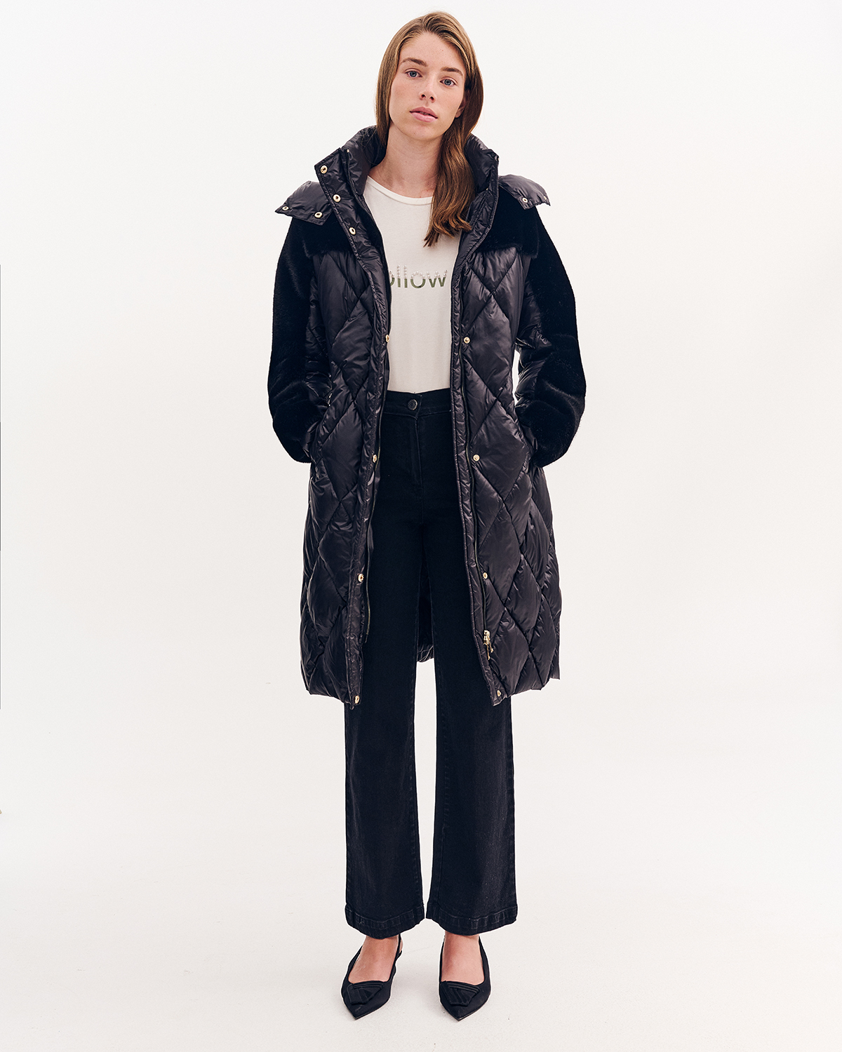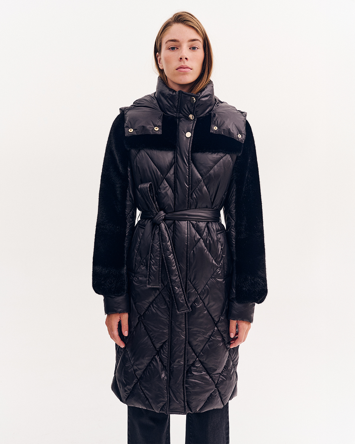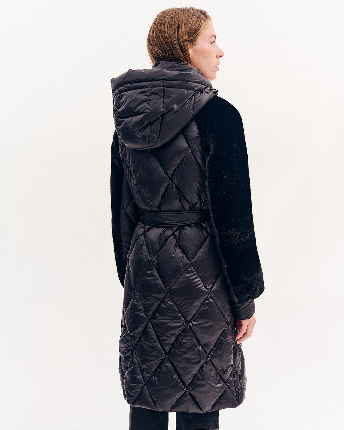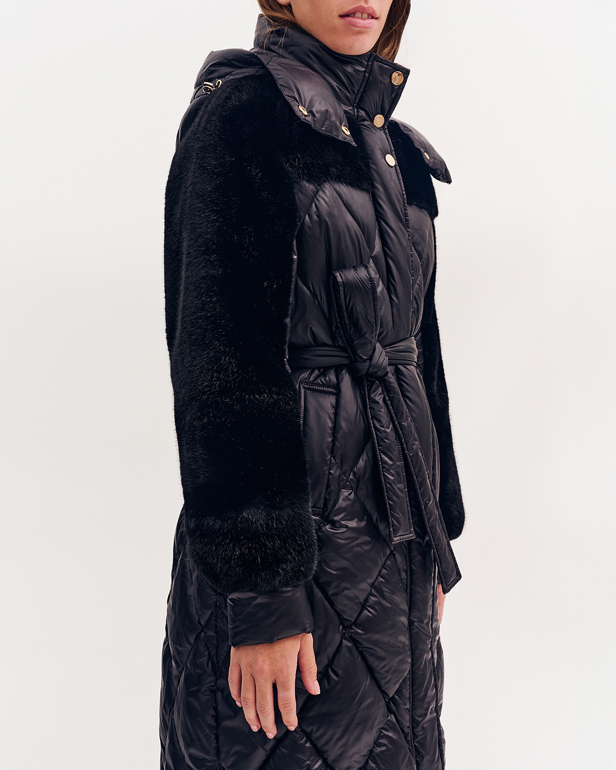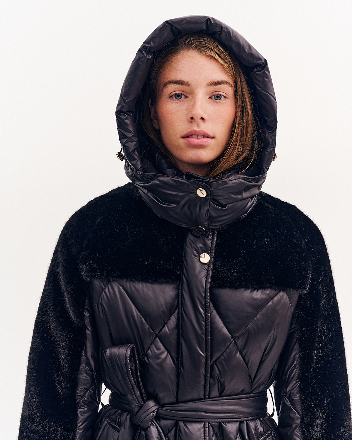 Μπουφάν καπιτονέ με γούνα. Μακρύ, με αποσπώμενη κουκούλα. Κλείσιμο με φερμουάρ και κουμπιά στο επάνω μέρος. Ζώνη στη μέση από το ίδιο ύφασμα με θηλιές και τσέπες μπροστά. Λεπτομέρεια, γούνα στους ώμους και στα μανίκια κατά μήκος.