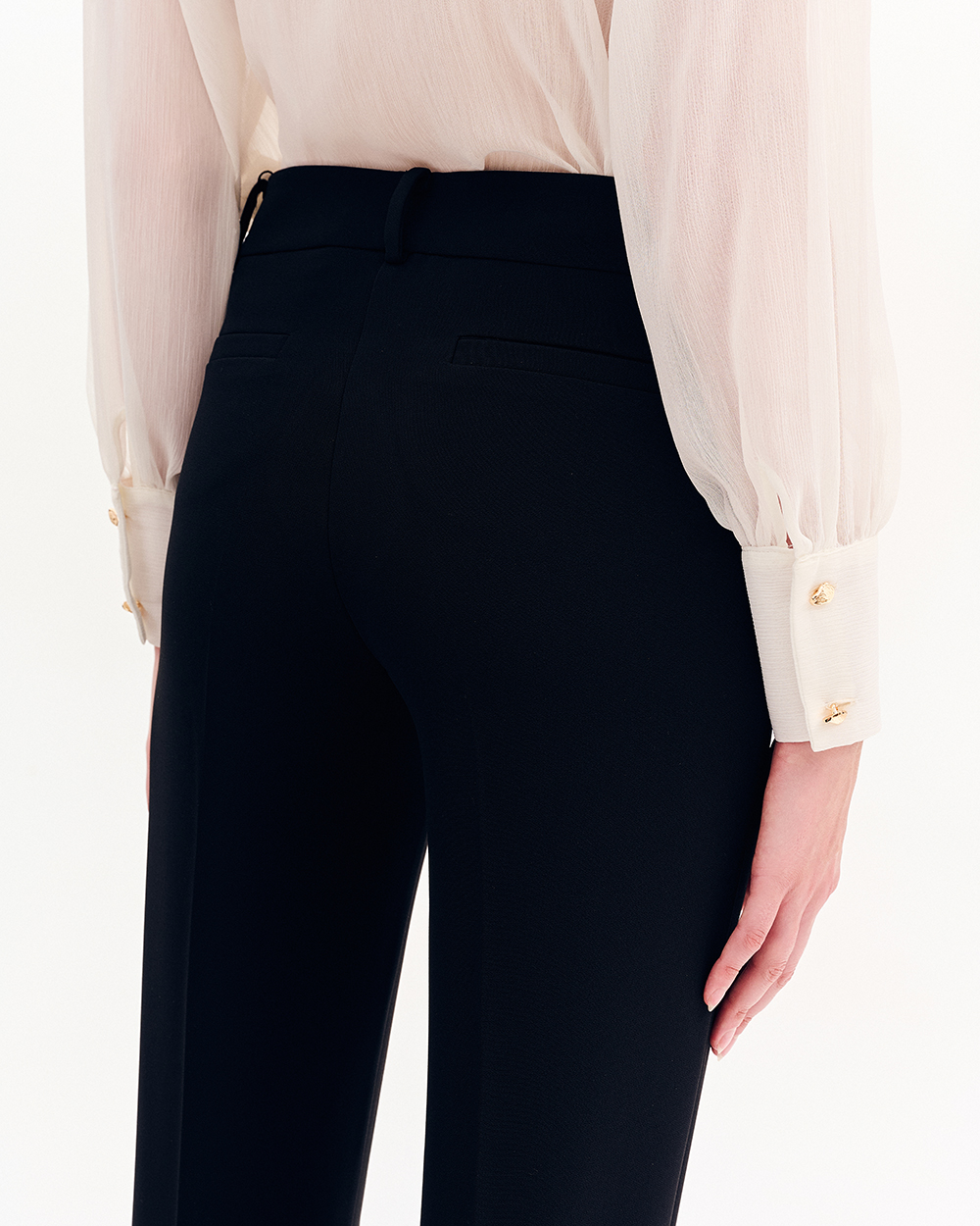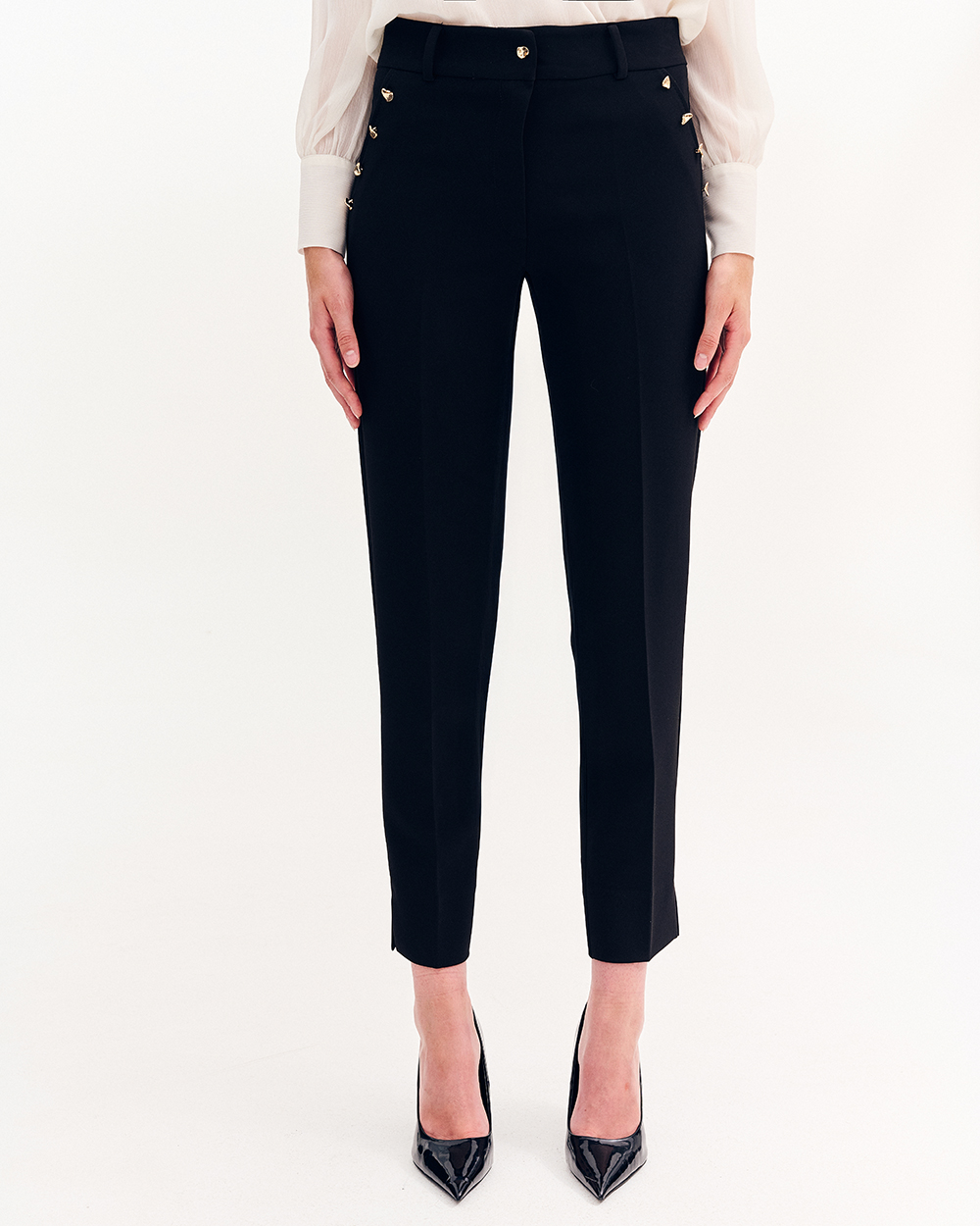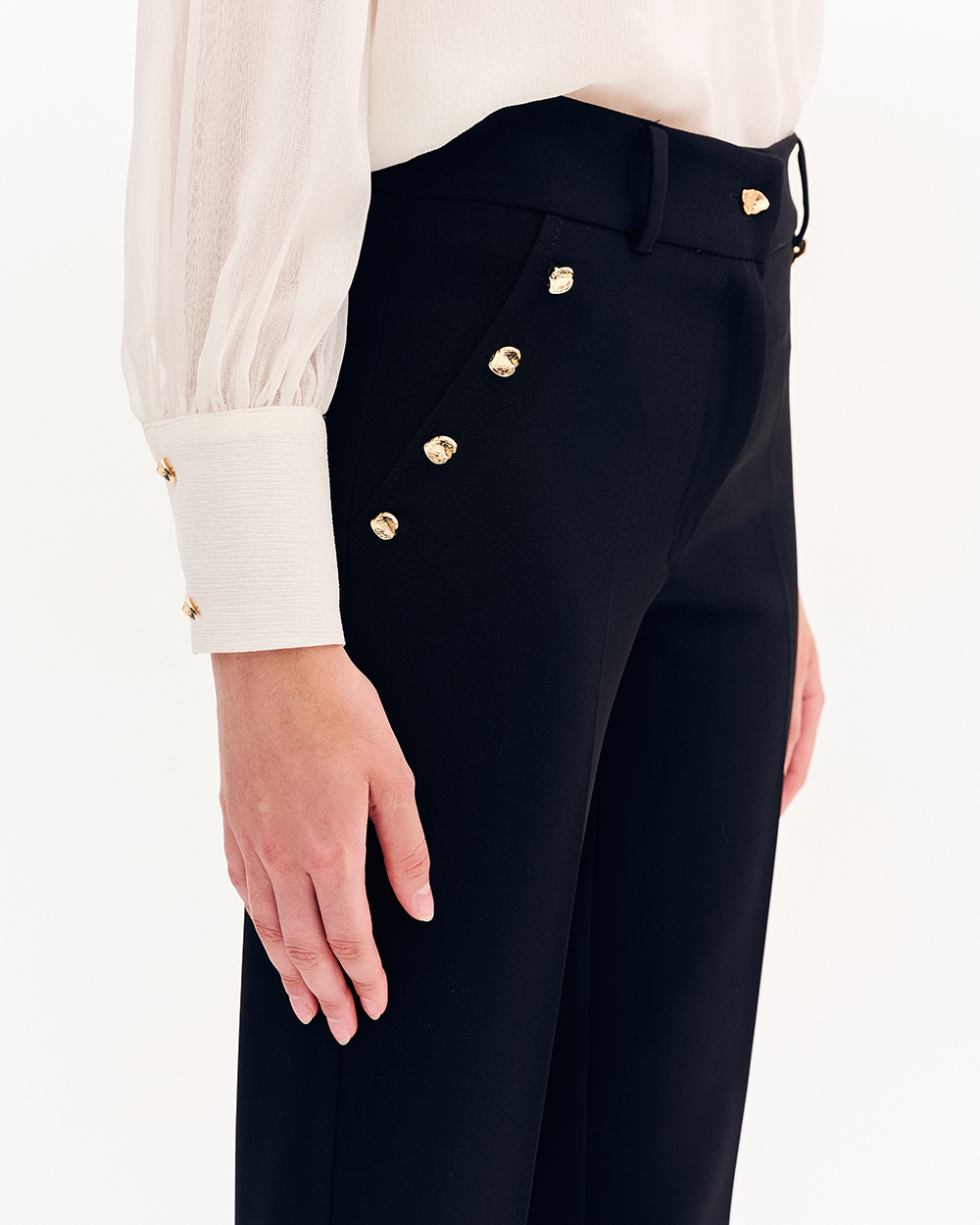 Παντελόνι σε cigarette γραμμή, κλειστές τσέπες στο μπροστινό μέρος με χρυσά διακοσμητικά κουμπία. Τσέπες φιλέτο στο πίσω μέρος. Κάτω μέρος με ανοίγματα στα πλάγια.