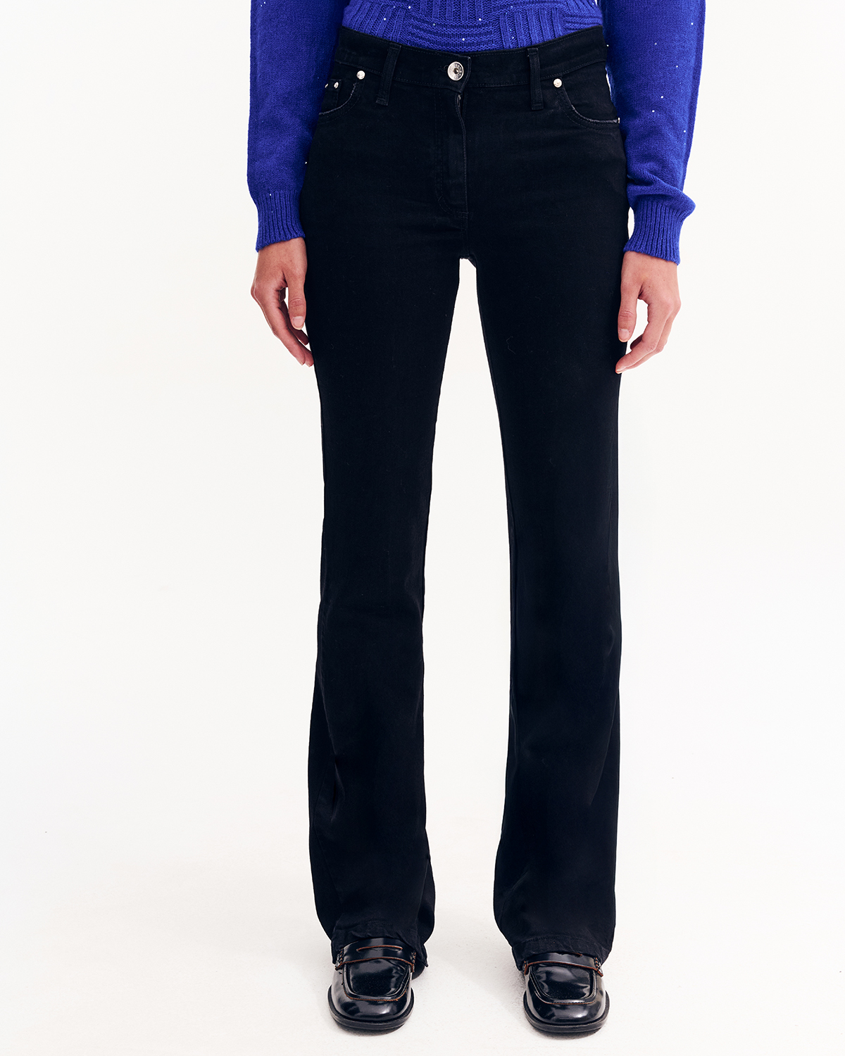 Παντελόνι τζιν καμπάνα σε βαμβακερό ύφασμα. Θηλιές για ζώνη. Κλείσιμο μπροστά με φερμουάρ και κουμπί.