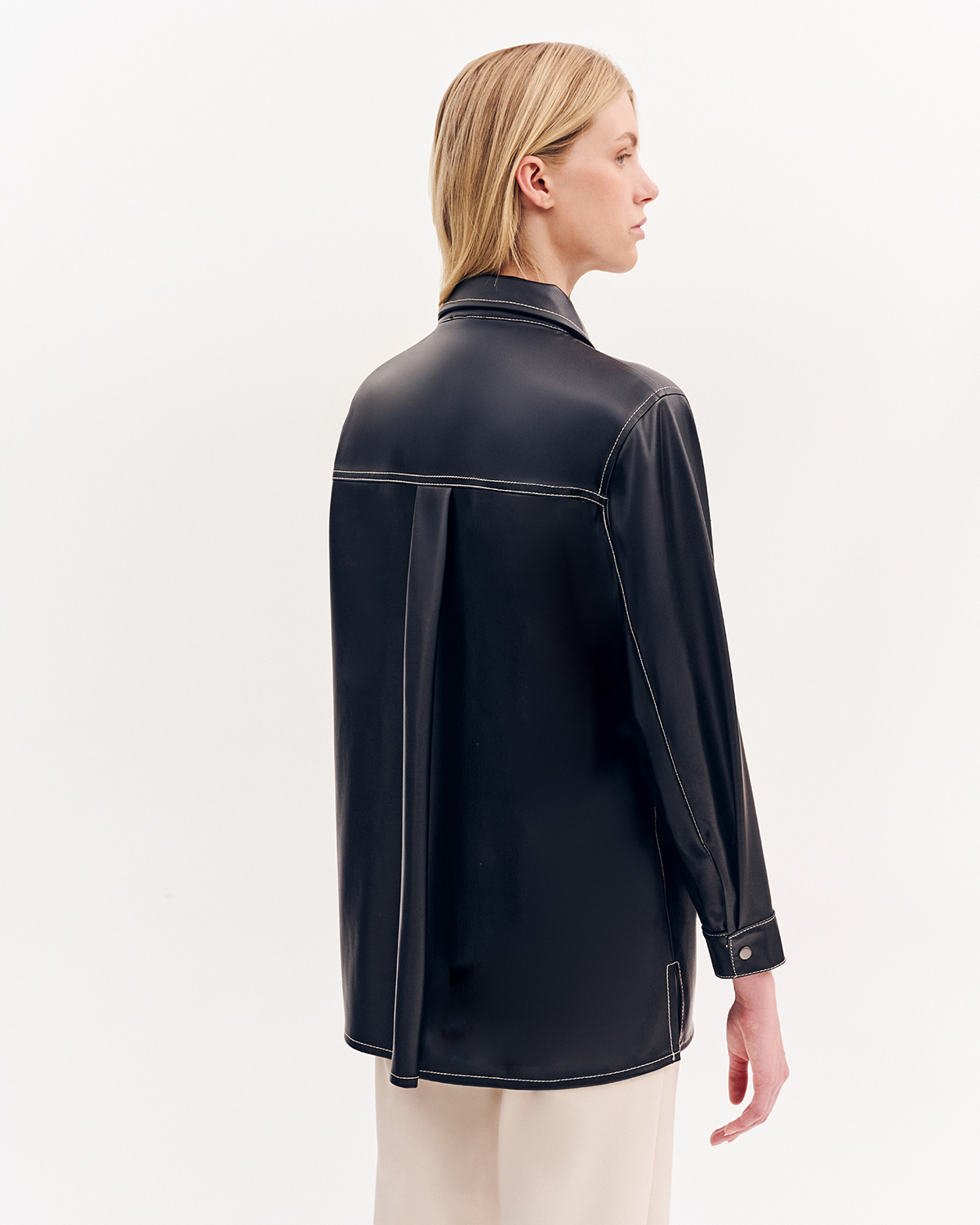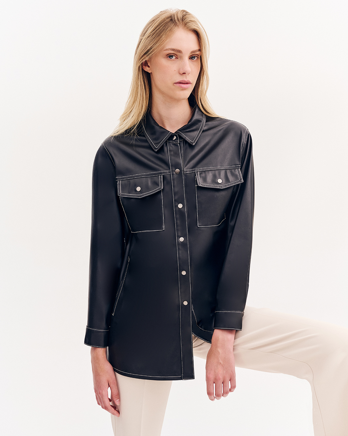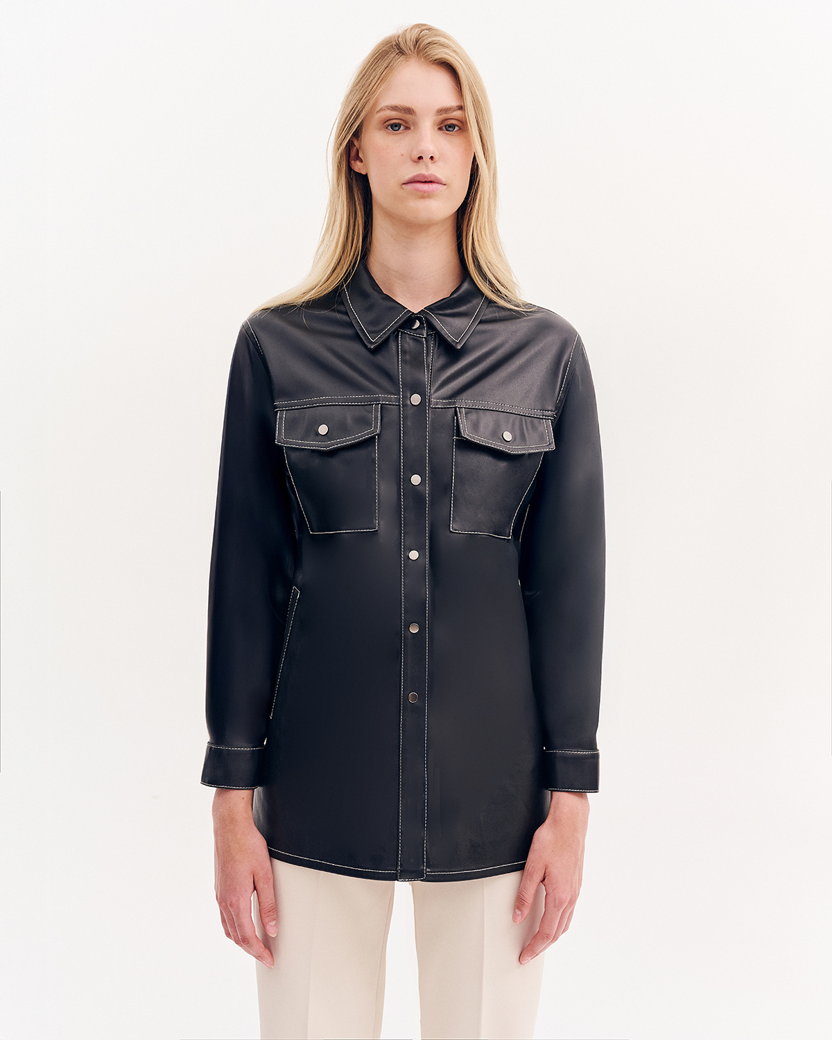 Πουκάμισο δερματίνη ίσιο, μακρύ. Με τσέπες στο πάνω μέρος με κουμπί και κοφτές πιο χαμηλά. Κλασικό γιακά, μακρύ μανίκι και μανσέτα με κουμπί.