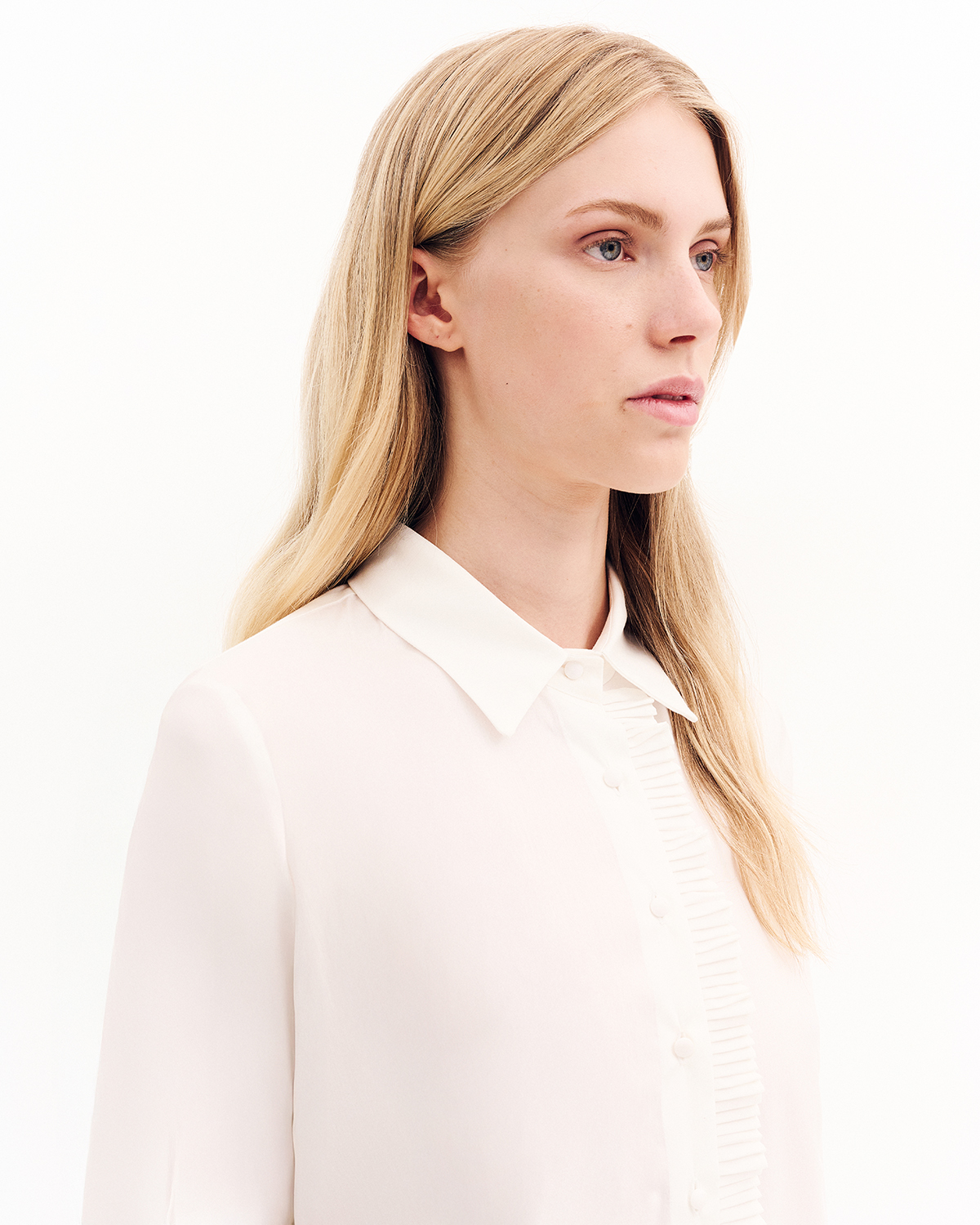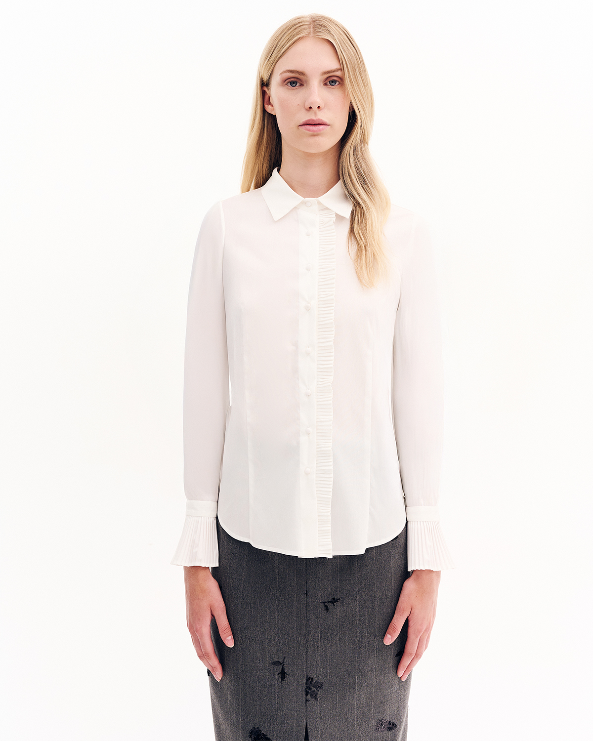 Πουκάμισο κλασικό σε μείγμα από βαμβάκι. Λεπτομέρεια βολάν στη πατιλέτα και στο τελείωμα των μανικίων.