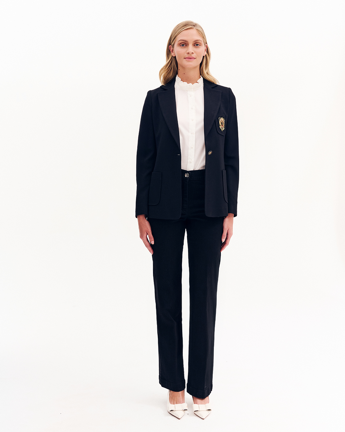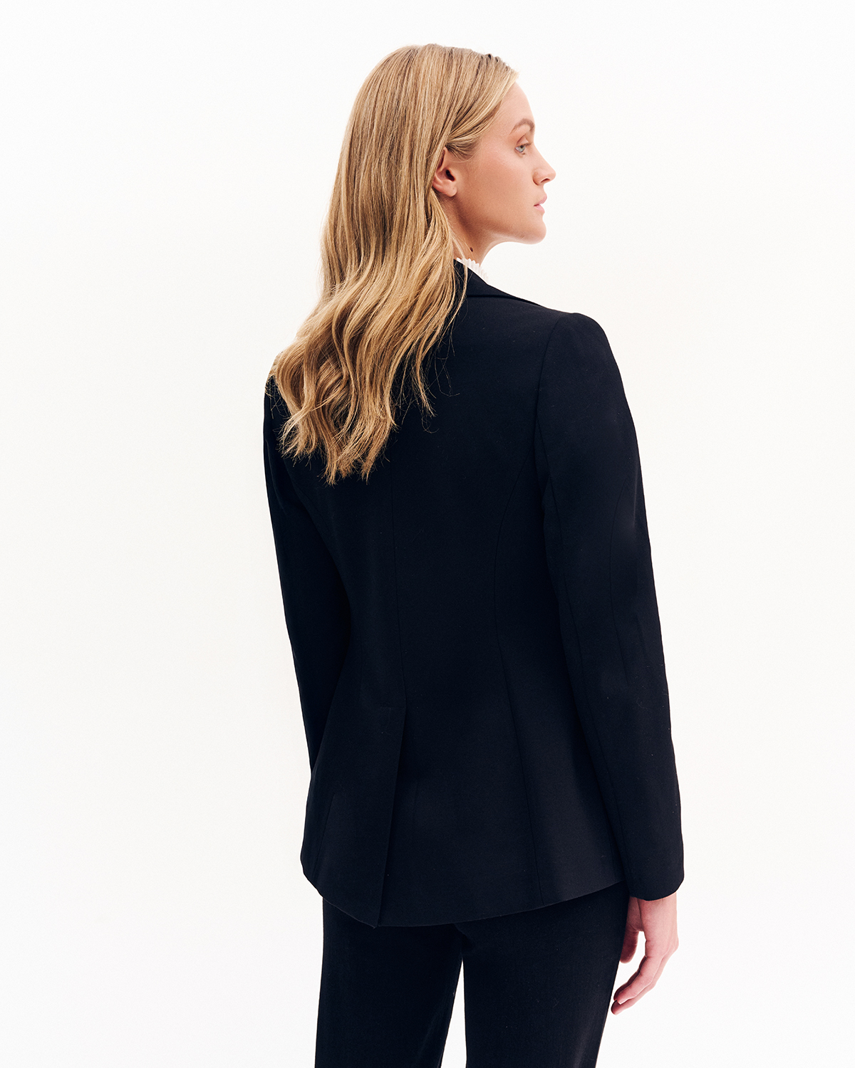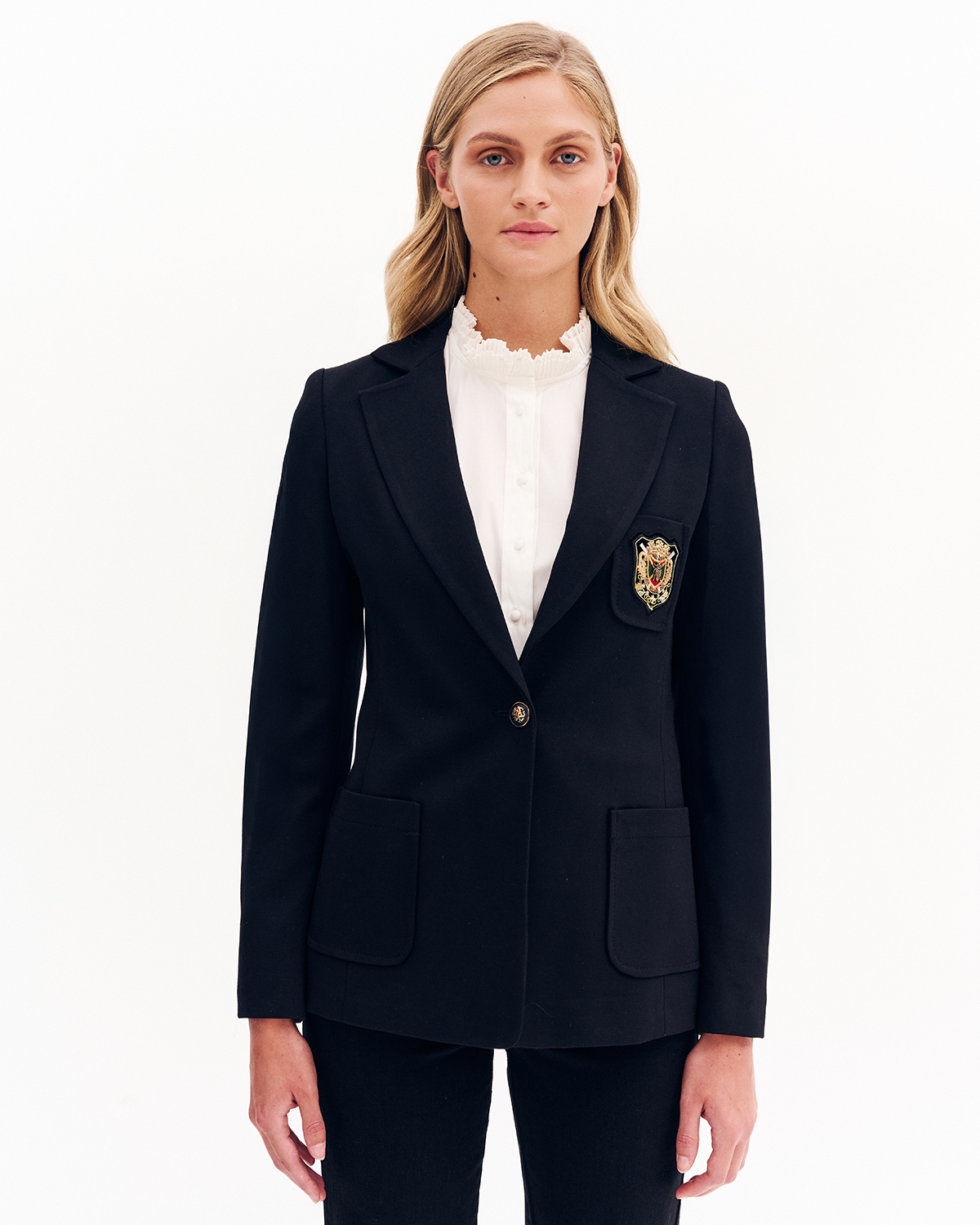 Σακάκι μεσάτο με τετράγωνες τσέπες. Γιακάς με πέτο και κλείσιμο μπροστά με κουμπί. Σκίσιμο στο πίσω μέρος, λεπτομέρεια, διακοσμητικό παράσημο.