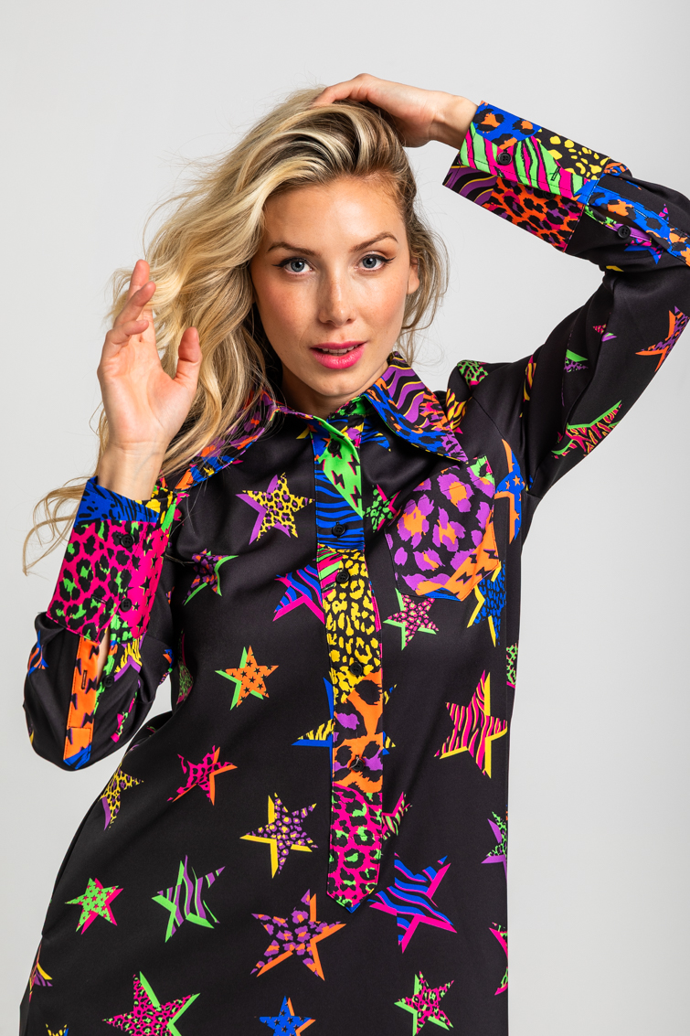 Μίνι φόρεμα σεμιζιέ, μακρυμάνικο σε γραμμή Α που χαρίζει κομψότητα και άνεση. Το τύπωμα με αστέρια του προσθέτει παιχνιδιάρικο χαρακτήρα, ενώ οι λεπτομέρειες animal print δημιουργούν μια ιδιαίτερη αντίθεση, κάνοντάς το ιδανικό για καθημερινές αλλά και βραδινές εμφανίσεις.