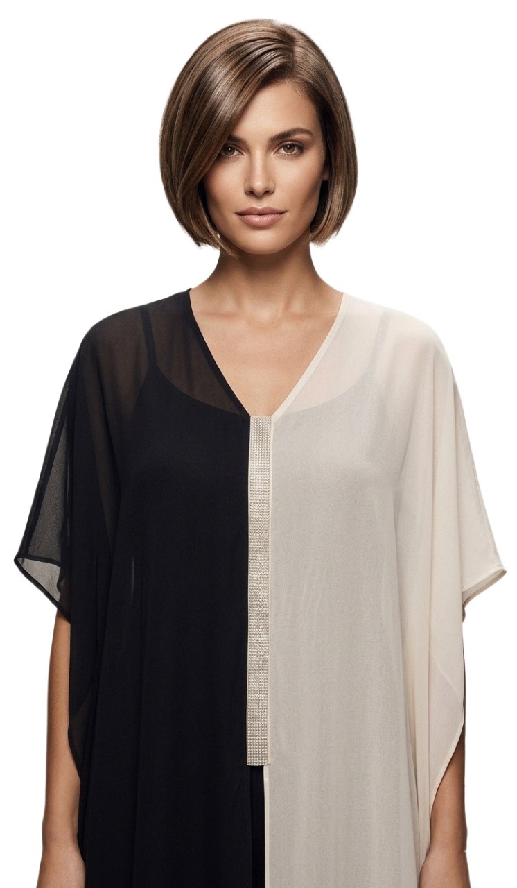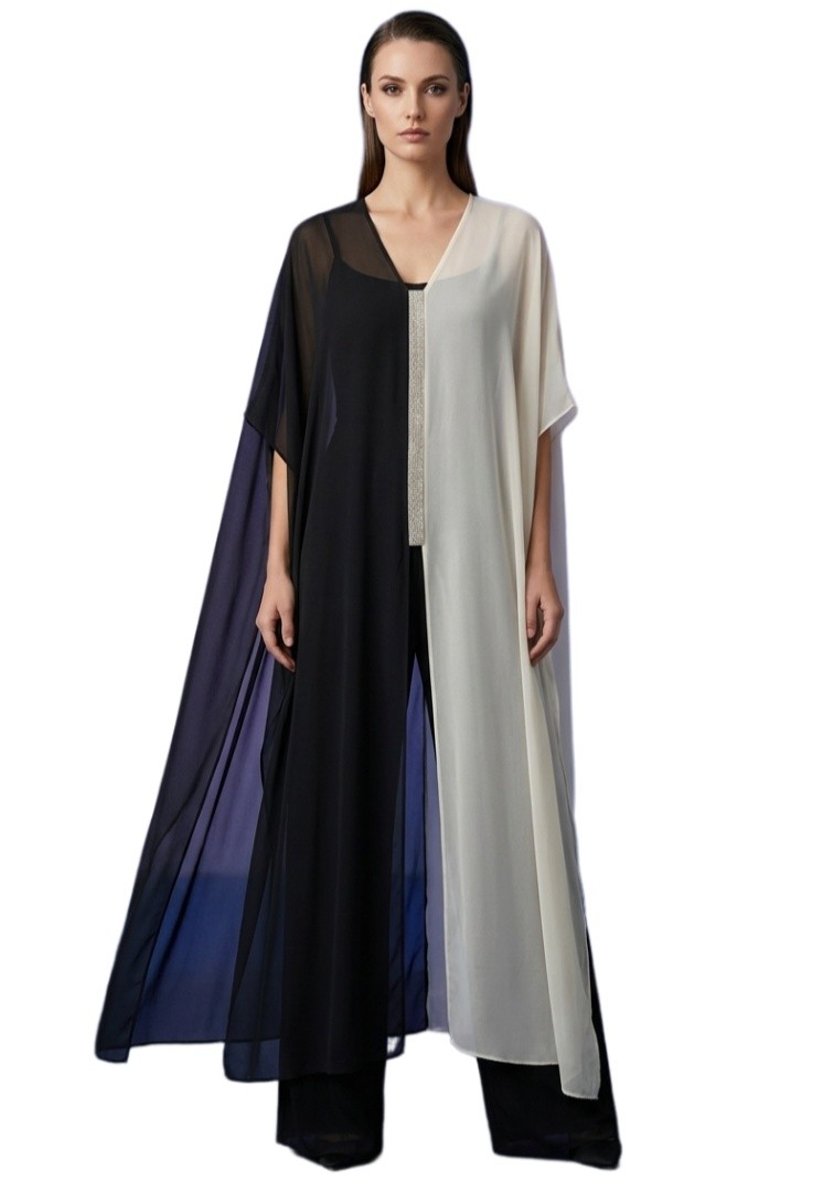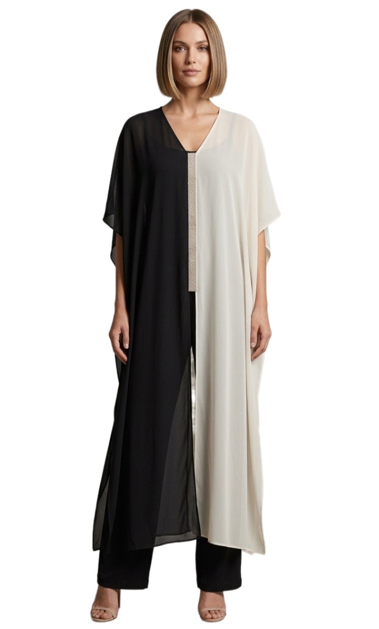 Ολόσωμη ελαστική φόρμα με αποσπώμενη μουσελίνα σε διχρωμία που προσθέτει αέρινη κίνηση. Διακοσμημένη με λεπτομέρεια από στρας. Διαθέτει εντυπωσιακά σκισίματα μπροστά, πίσω και στο πλάι. Κλείσιμο στην πλάτη με κουμπί.