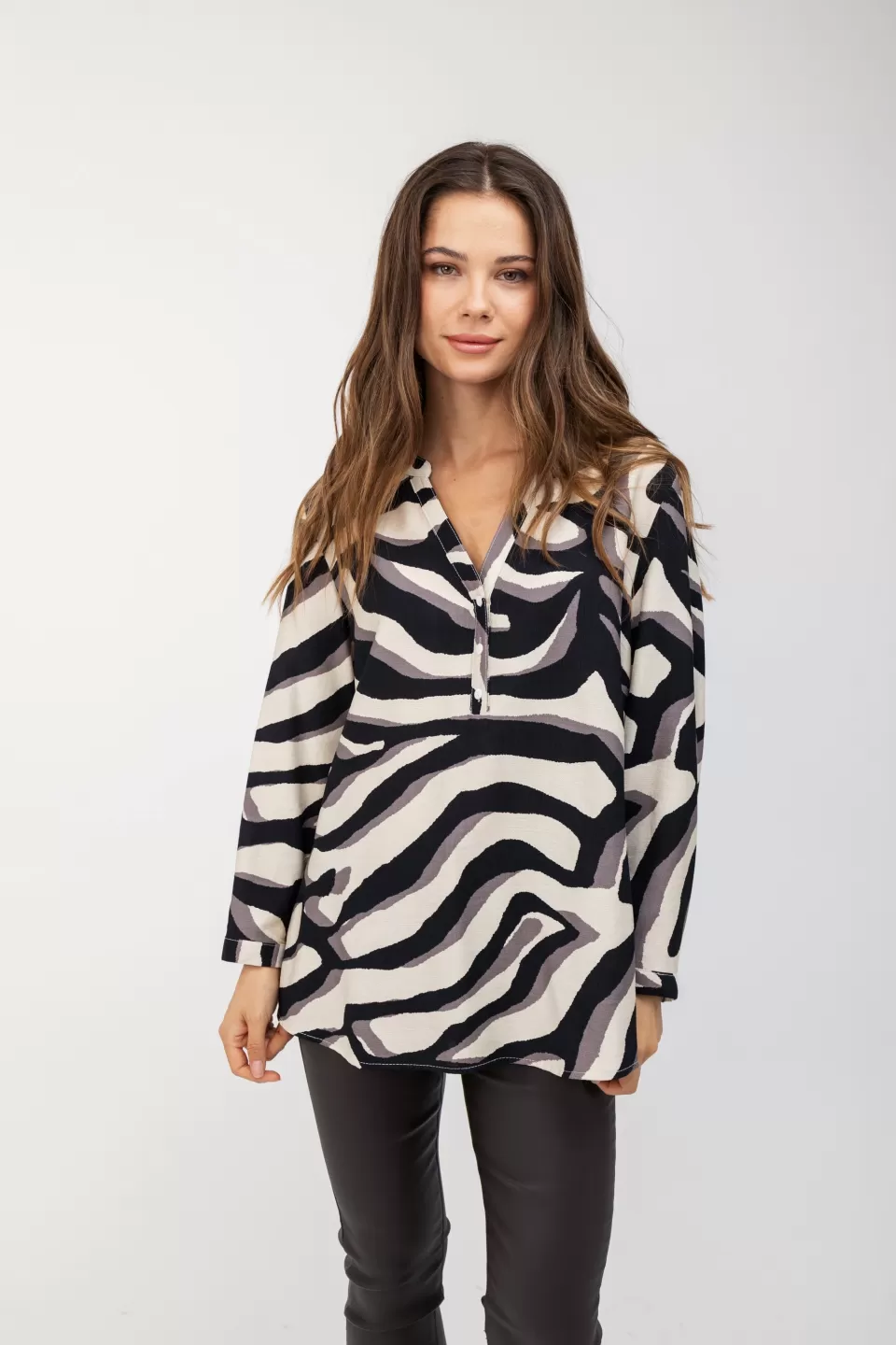 Πουκάμισο σε μπεζ χρώμα με μαύρα και γκρι εμπριμέ σχέδια. Κλείσιμο με κουμπιά.