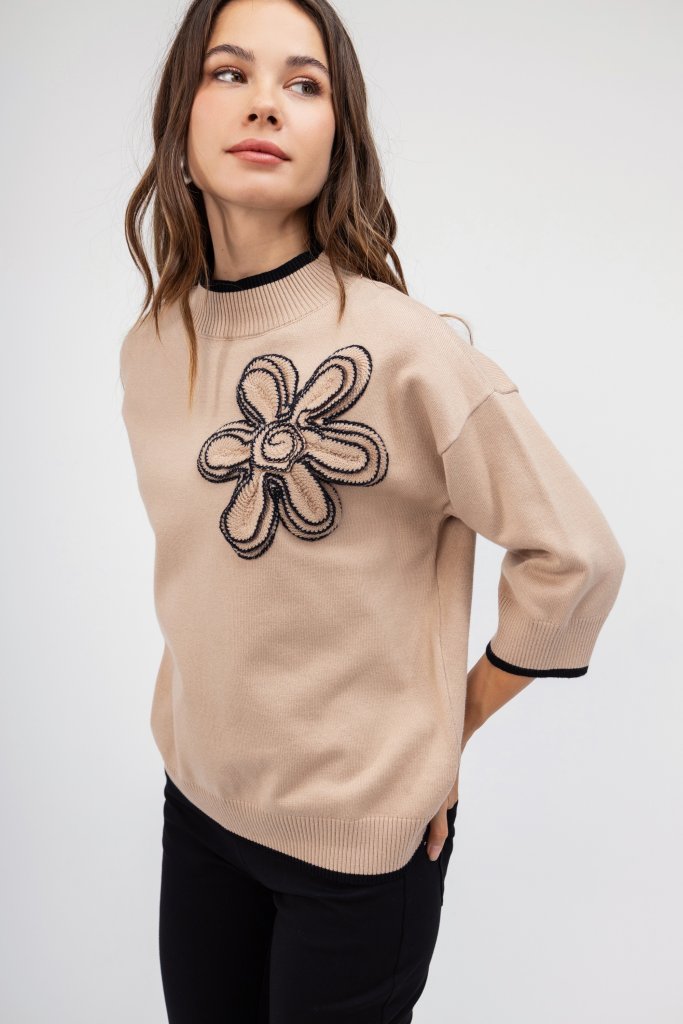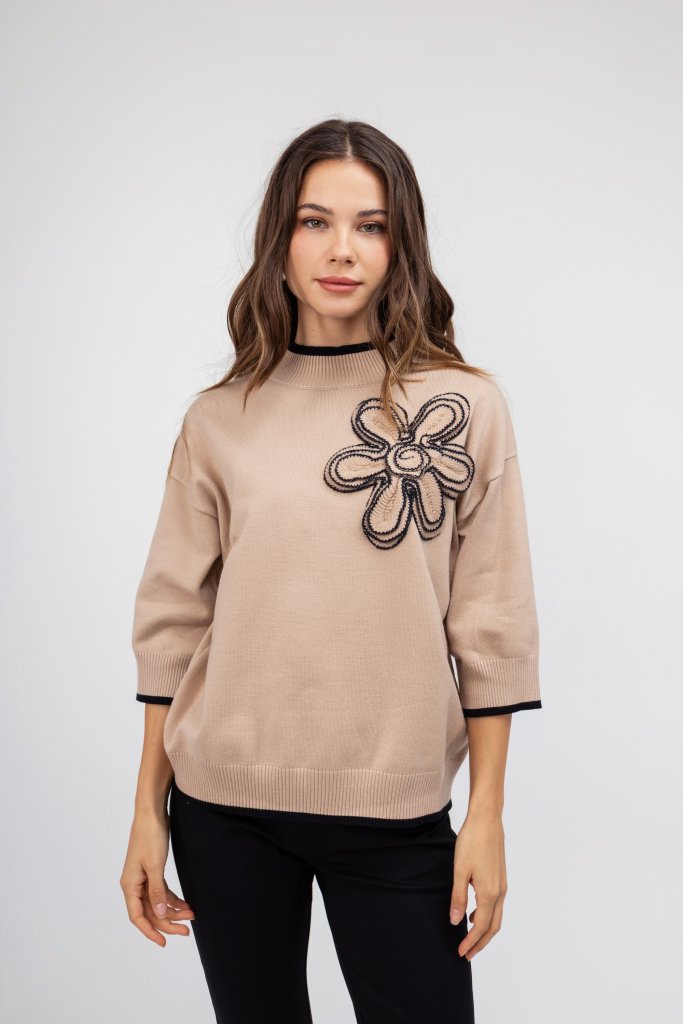 Πουλόβερ με σχέδιο κεντητό λουλούδι. Διαθέτει κοντά μανίκια και λευκές διακριτικές λεπτομέρείες.
