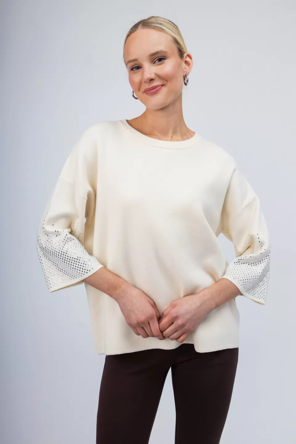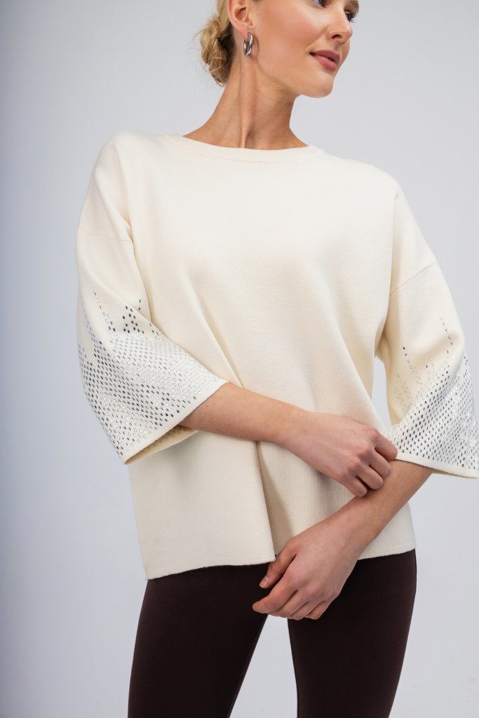 Πουλόβερ με strass στα μανίκια. Διαθέτει κλειστή λαιμόκοψη και άνετη γραμμή.