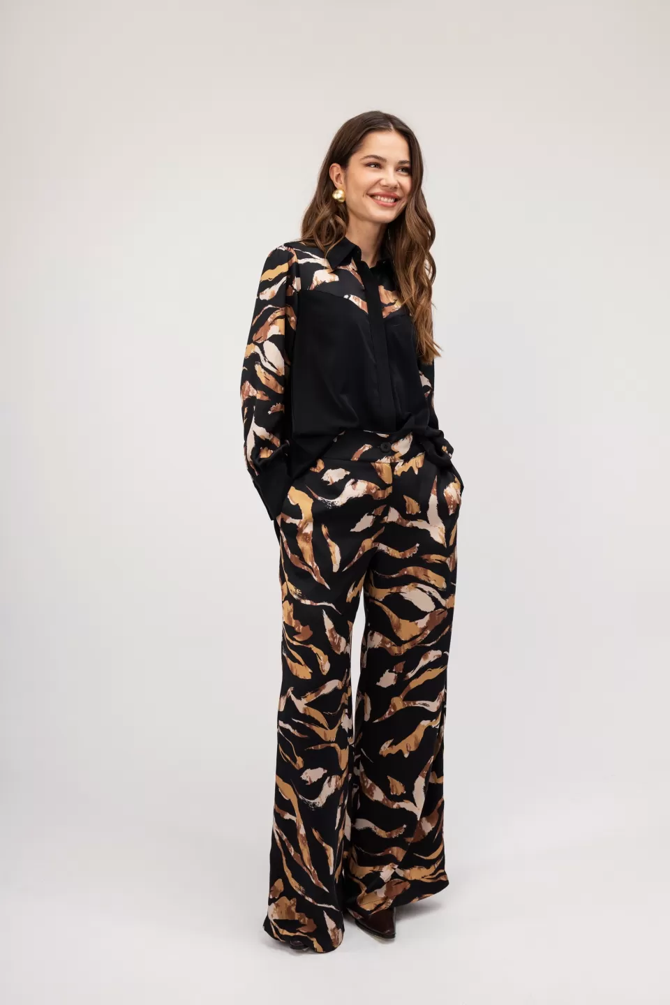 Πουκάμισο μακρυμάνικο με λεπτομέρεια animal print και γιακά. Παντελόνα animal print με λάστιχο στο πίσω μέρος και πλαινές τσέπες. Κλείσιμο μπροστά με φερμουάρ και κουμπί.