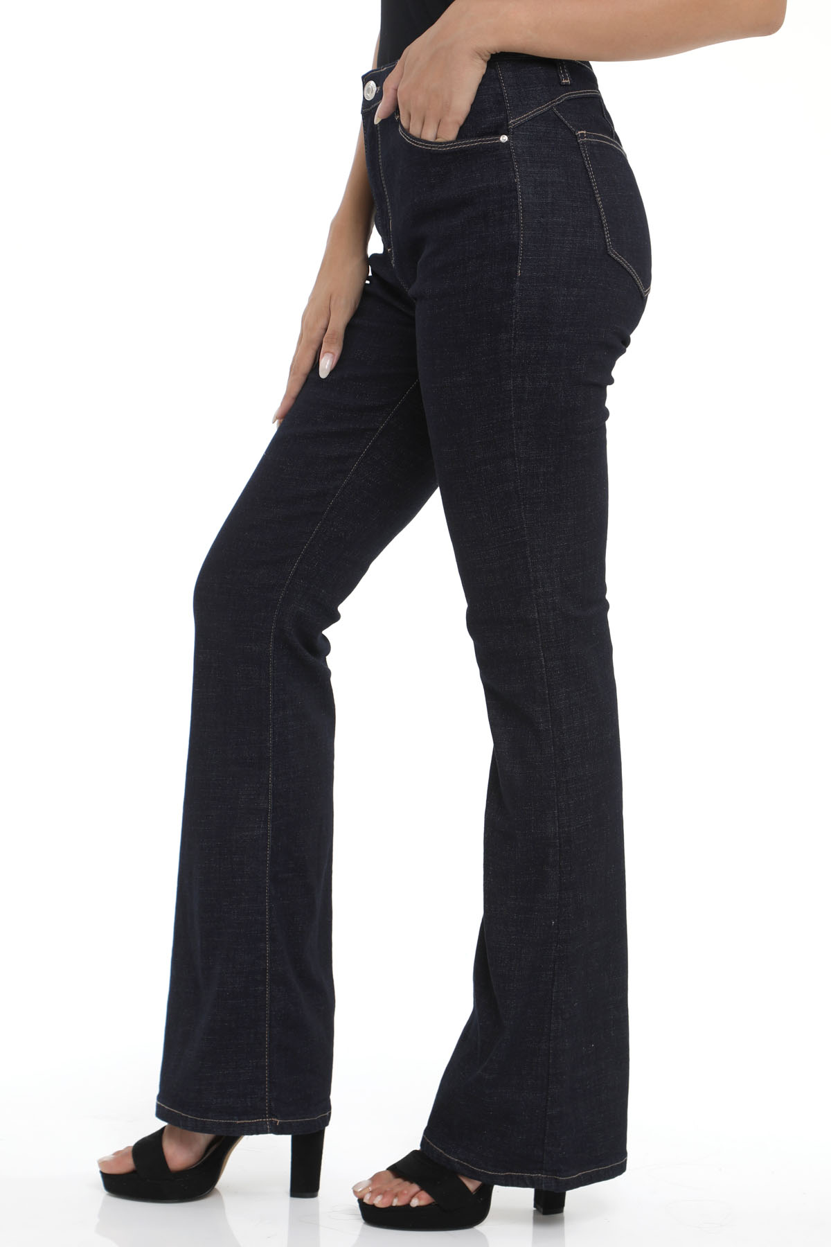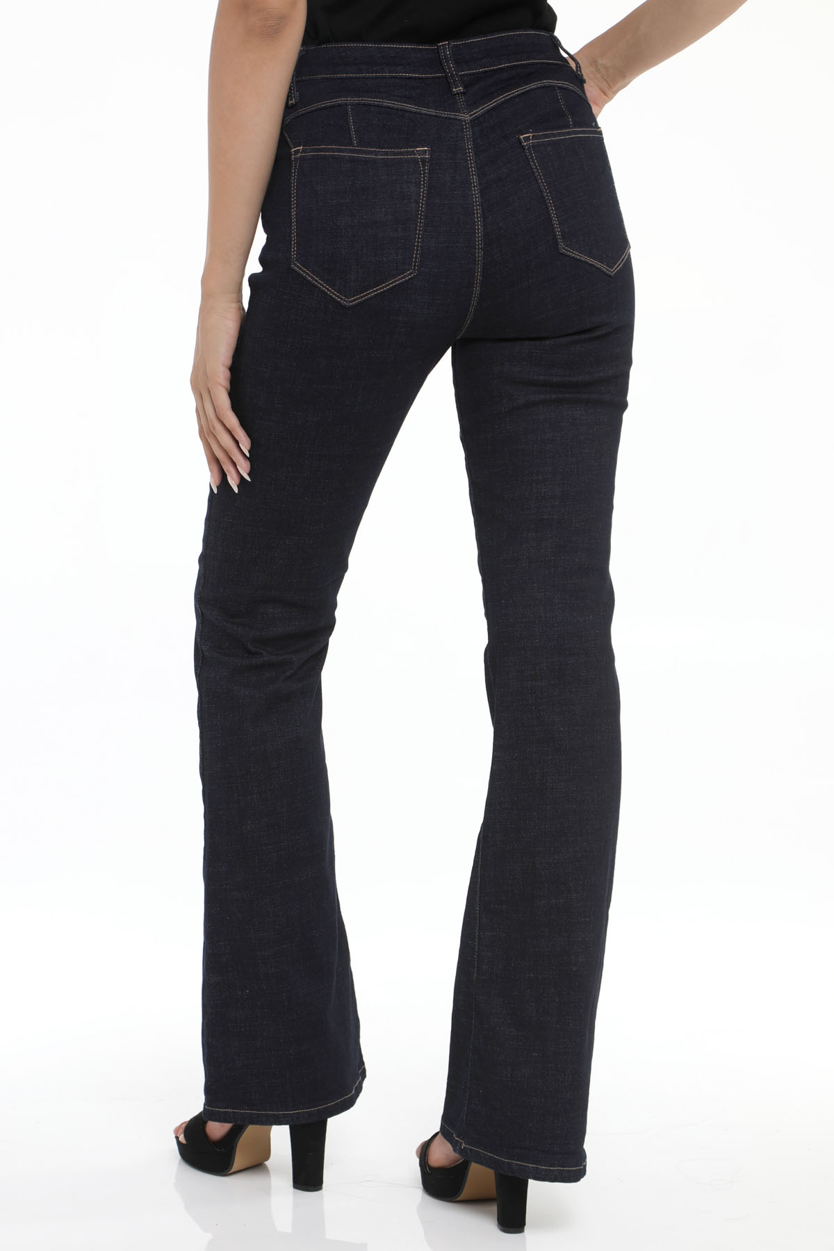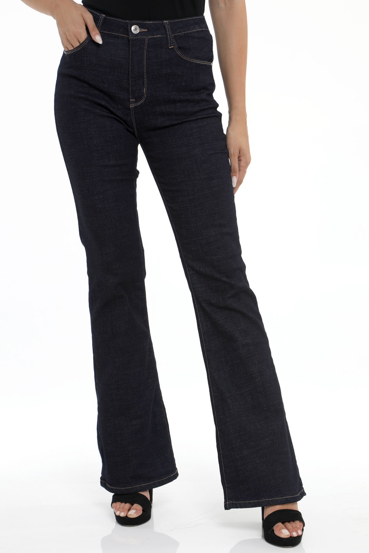 Παντελόνι τζιν καμπάνα σκούρο μπλε με τσέπες. Κλείσιμο με κουμπί και φερμουάρ.