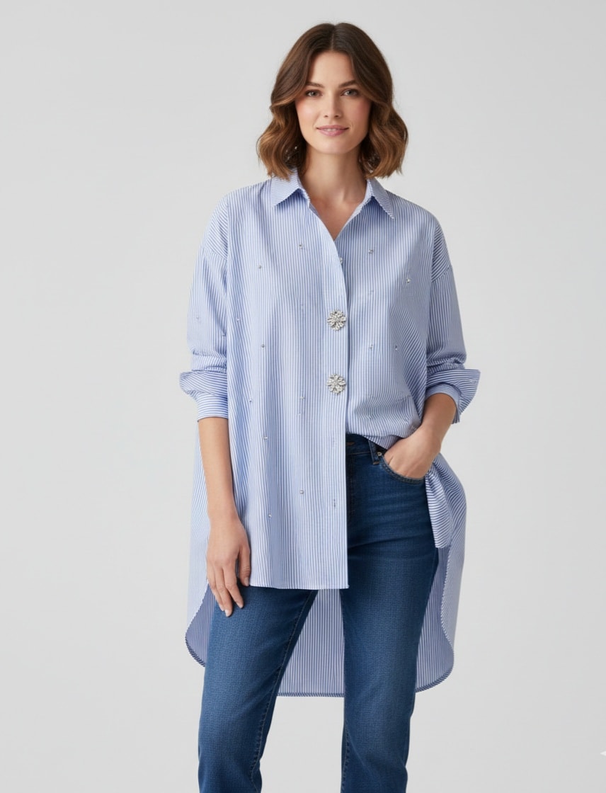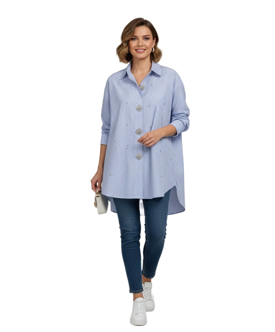 Ασύμμετρο oversized ριγέ πουκάμισο, με εντυπωσιακές λεπτομέρειες από στρας. Διαθέτει κουμπιά από στρας, γιακά και μακριά μανίκια.